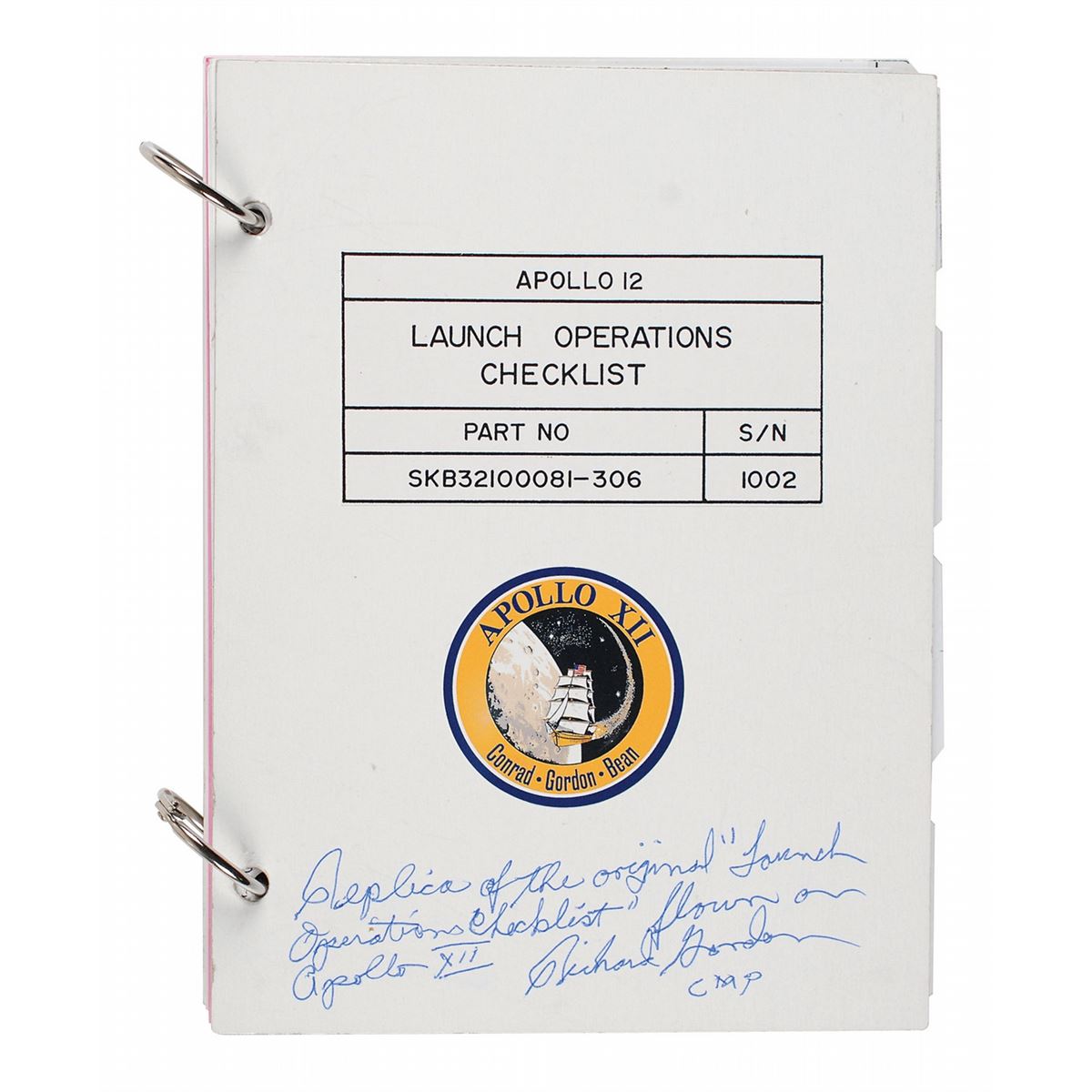 Limited edition replica Apollo 12 Launch Operations Checklist, numbered 46/50, 6 x 8, signed on the front cover in blue ballpoint, “Replica of the original ‘Launch Operations Checklist’ flown on Apollo XII. Richard Gordon CMP.” The back cover also bears a label signed by the artist, Linda Gordon, Richard’s wife. In fine condition.