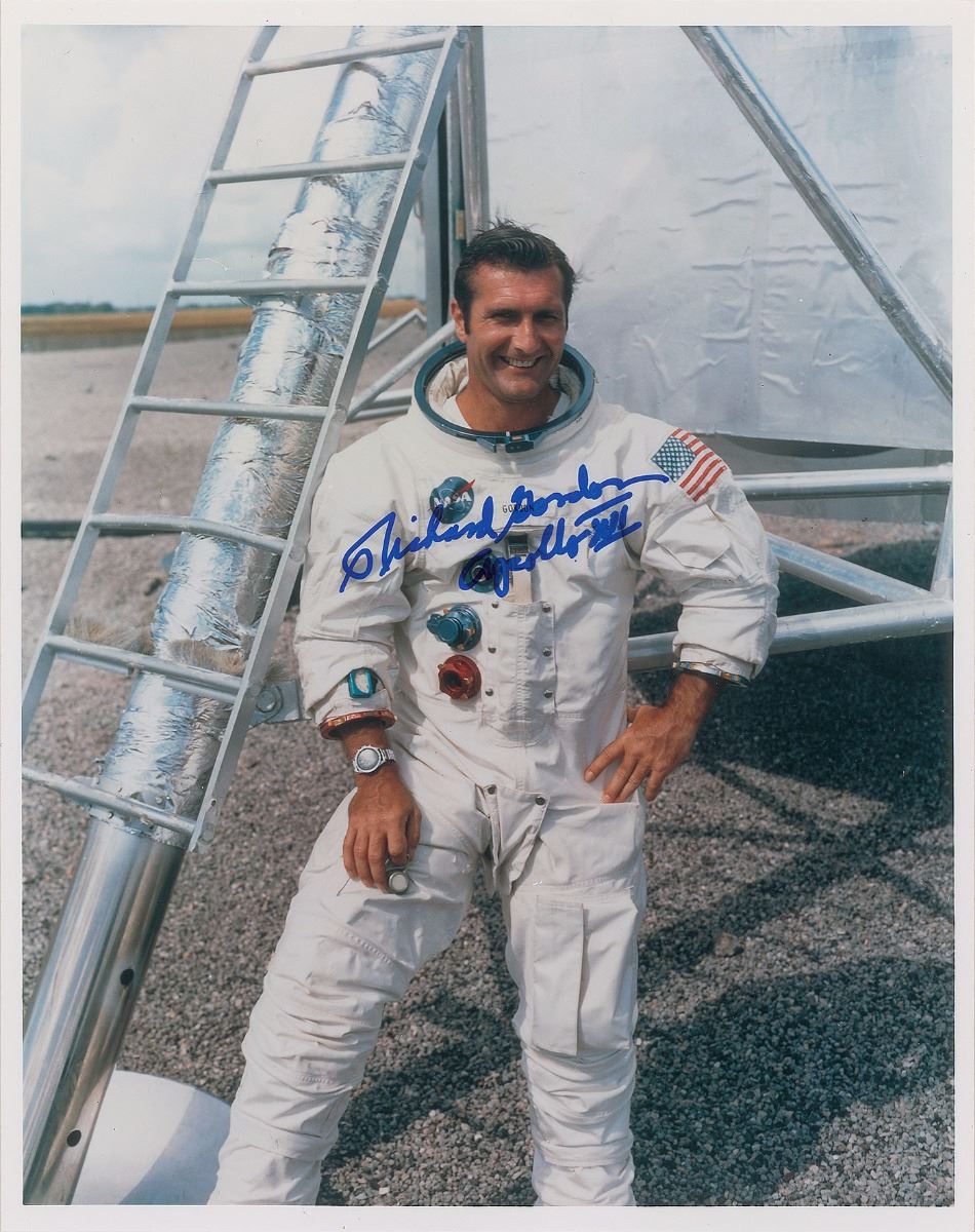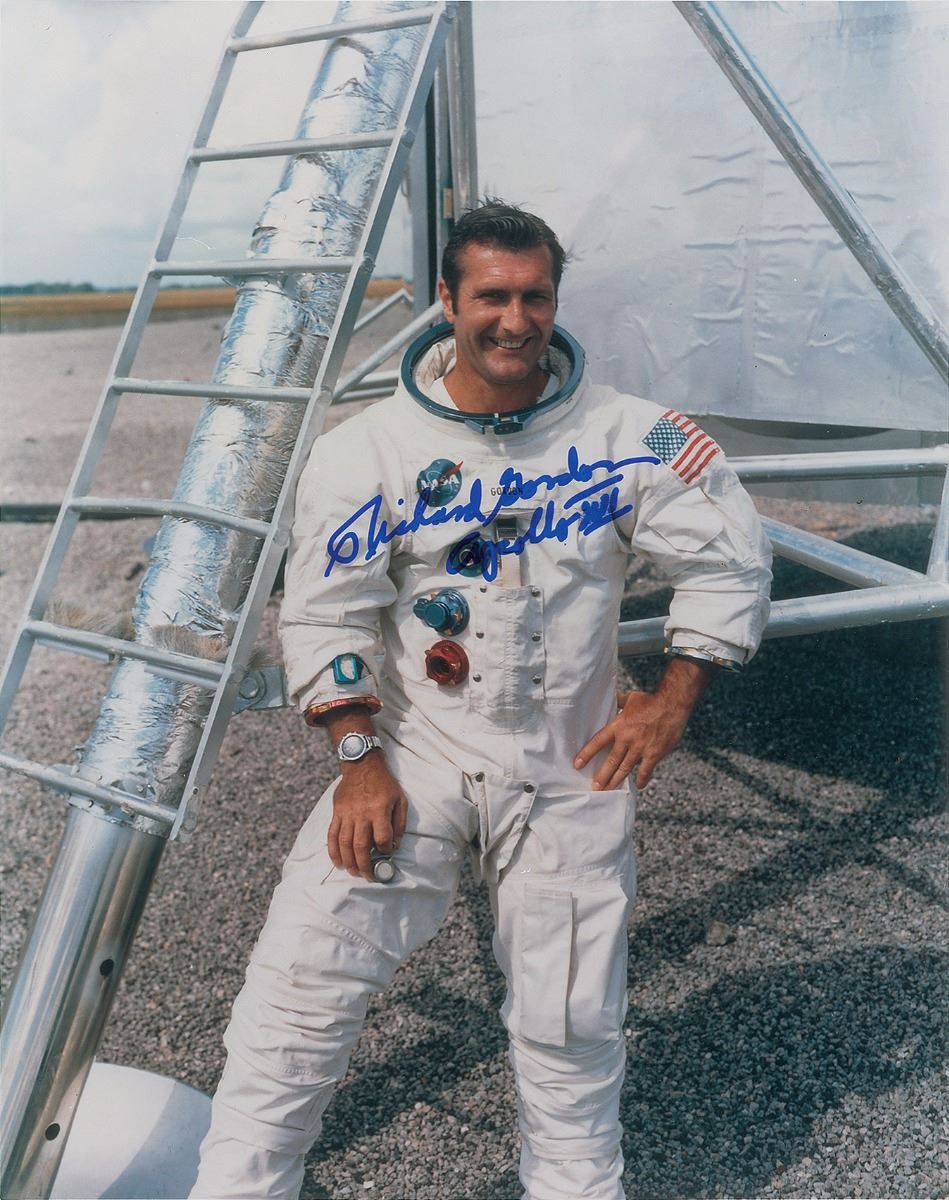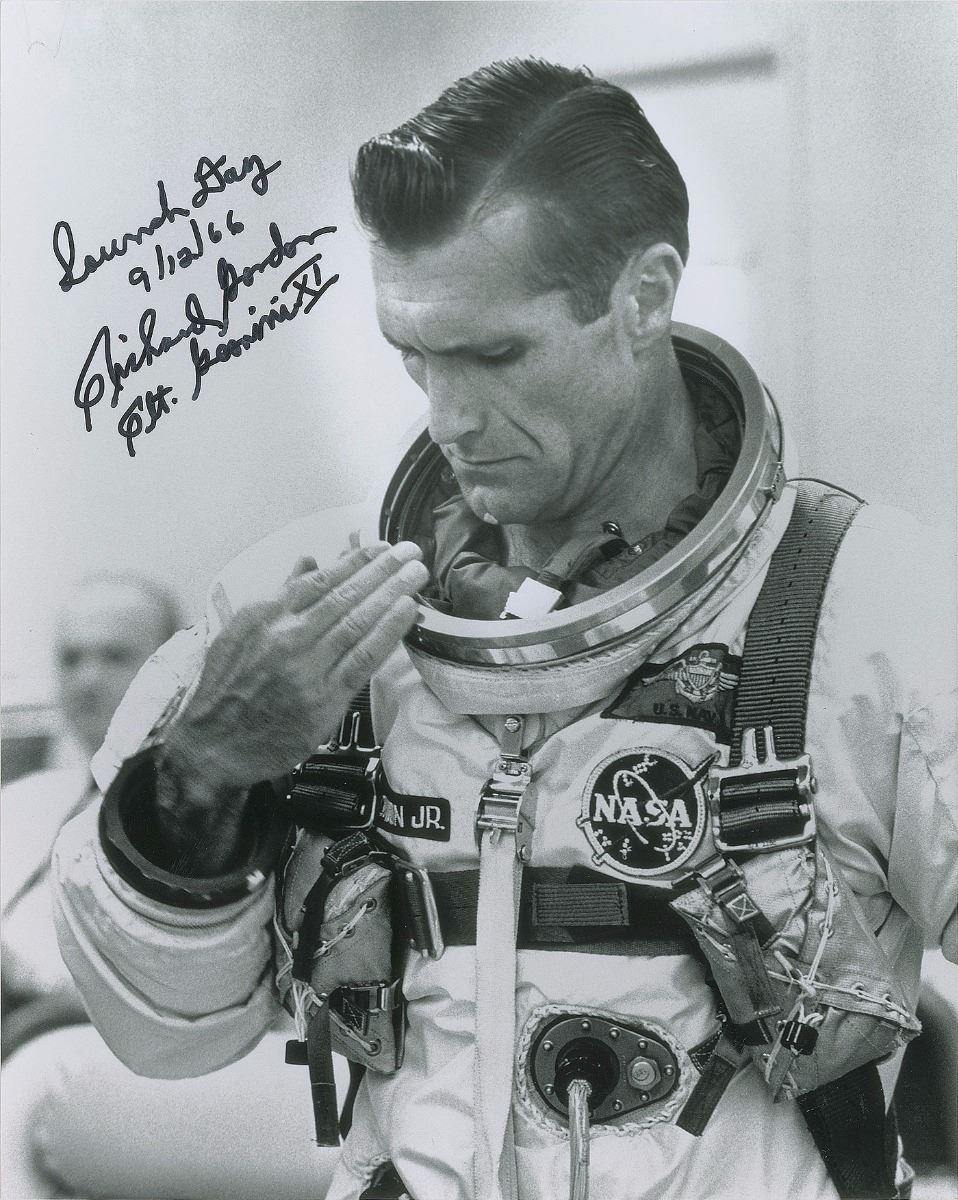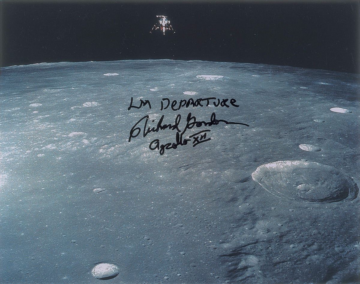 Collection of three glossy and satin-finish photos, 8 x 10 and 10 x 8, each signed in felt tip by Gordon, with subjects including: one showing him prior to his Gemini mission, signed, “Launch Day, 9/12/66, Richard Gordon, Plt. Gemini XI”; one of him in his space suit, signed, “Richard Gordon, Apollo XII”; and one of the Lunar Module leaving the lunar surface, signed, “LM Departure, Richard Gordon, Apollo XII.” In overall fine condition.