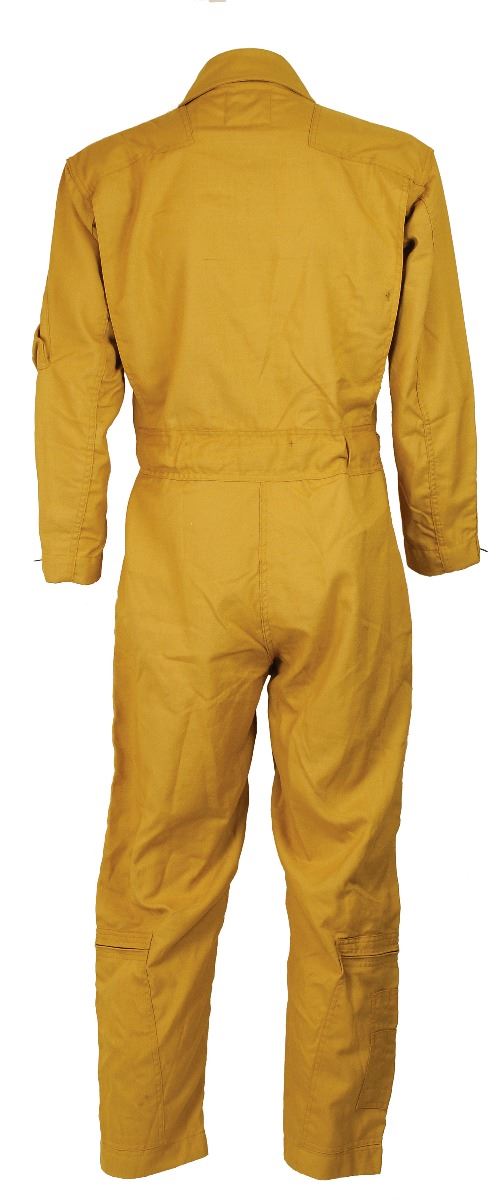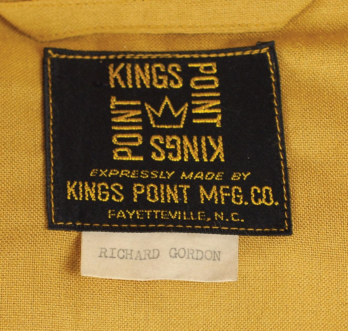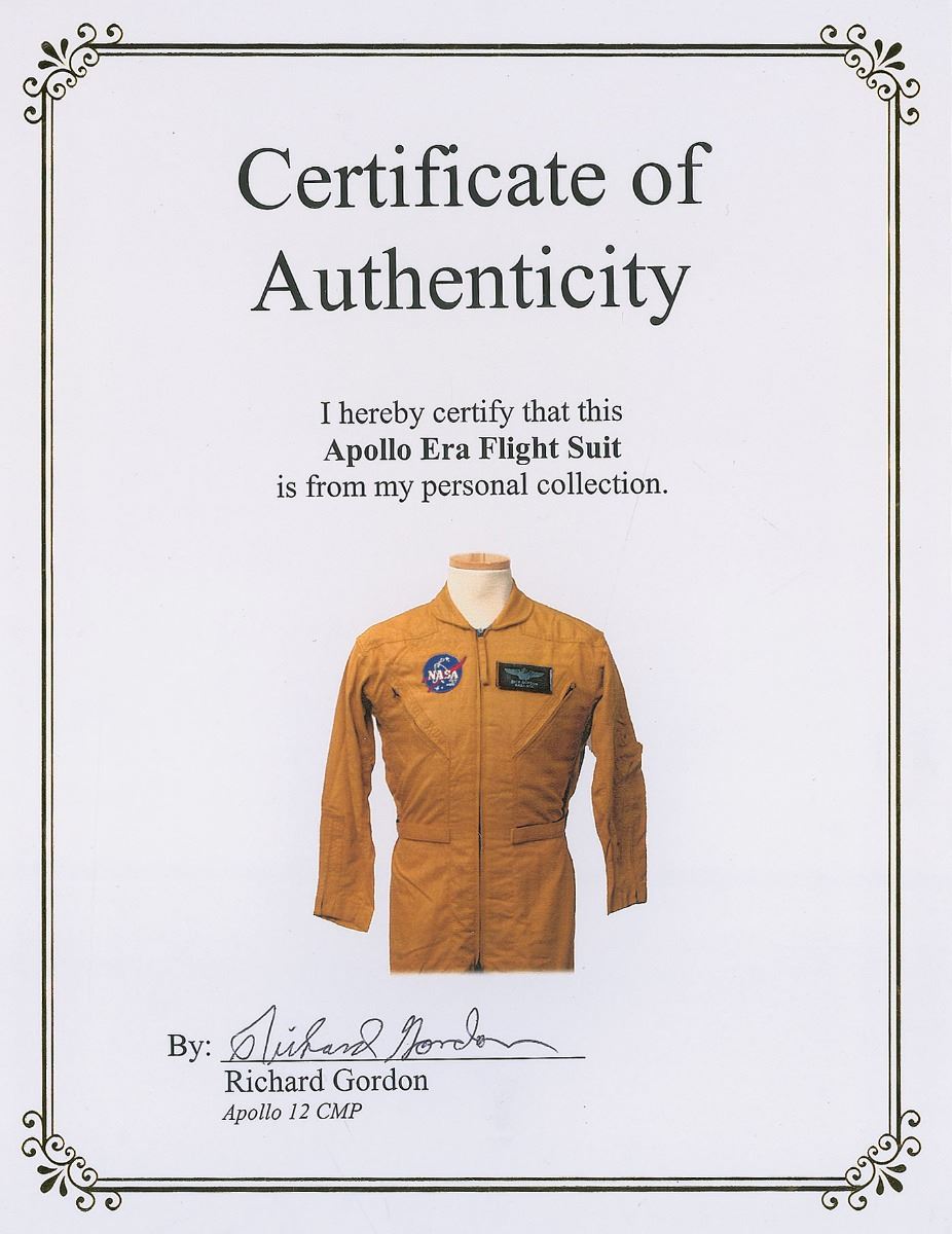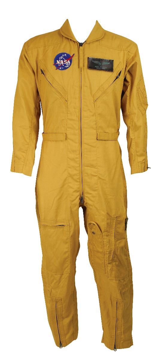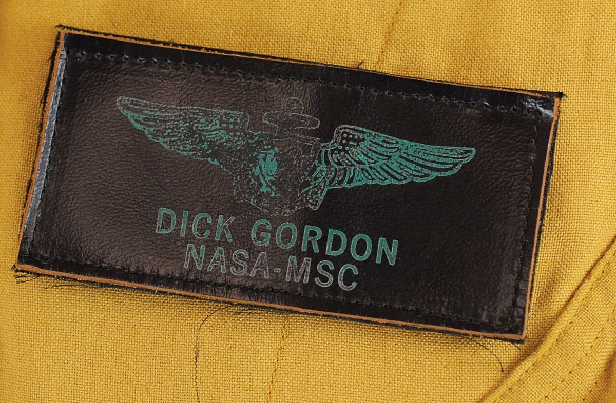 Richard Gordon’s mustard-color rough cotton Apollo-era NASA flight suit with an official ‘meatball’ patch on the right breast and a leather name patch reading “Dick Gordon, NASA-MSC” affixed with Velcro over the left breast. The Kings Point manufacturer’s tag is sewn into the collar area, with a small identification tag below, “Richard Gordon.” The suit exhibits typical wear from use. Accompanied by a signed certificate of authenticity from Gordon, in full: “I hereby certify that this Apollo Era Flight Suit is from my personal collection.” A fabulous Apollo item with excellent provenance from the astronaut himself. The Leon Ford Collection.