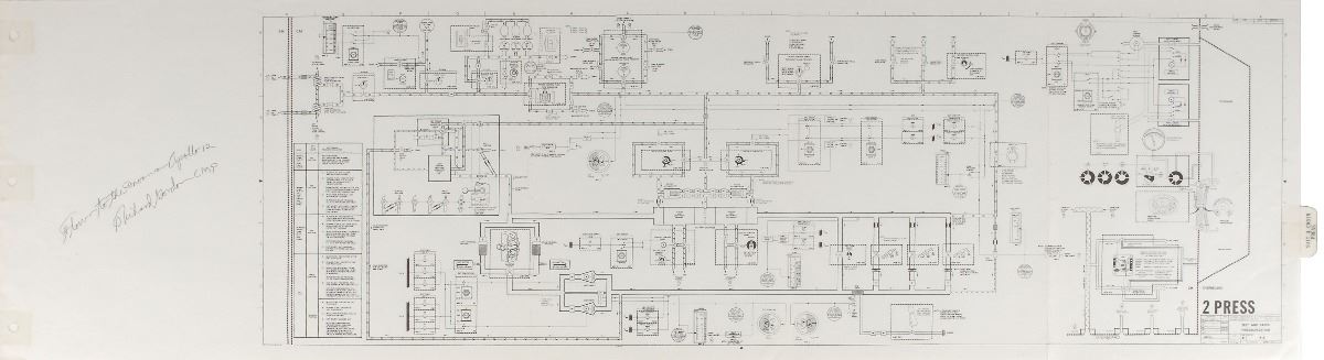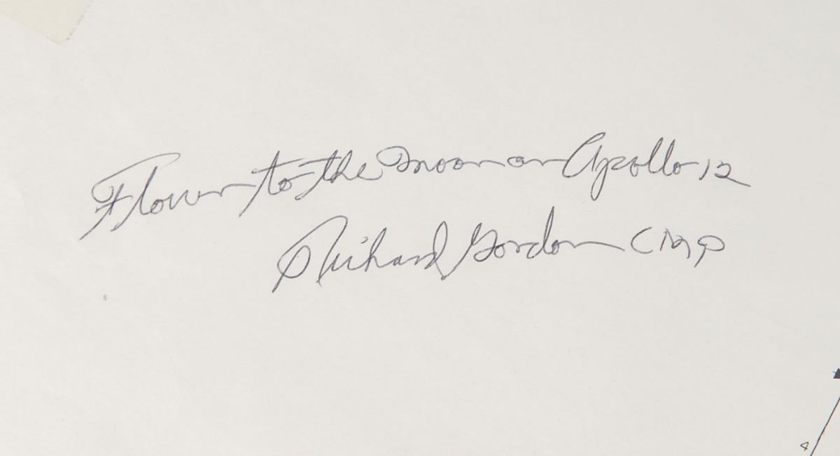 Flown Apollo 12 CSM schematic for the suit and cabin pressurization system, 36.5 x 10.5, signed and flight-certified in the blank first panel in black ballpoint, "Flown to the moon on Apollo 12, Richard Gordon CMP." The schematic bears an affixed tab on the right edge, "Suit & Cabin Press," and diagrams the flow through the environmental hardware of the spacecraft, consisting of many valves, control panels, tanks, gauges, and switches. In fine condition. A desirable moon-flown schematic of one of the critical systems for survival in the vacuum of space. Pre-certified Zarelli Space Authentication.