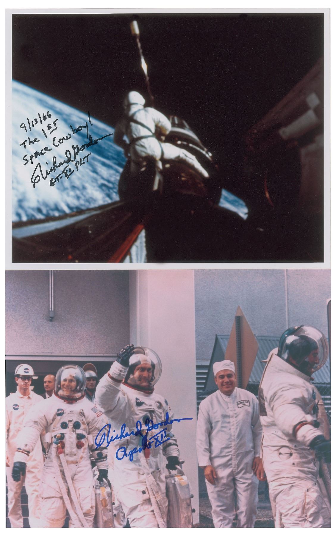 Two signed photos: a color satin-finish 10 x 8 photo of Richard Gordon performing an EVA during the Gemini 11 mission, signed in black felt tip, "9/13/66, The 1st Space Cowboy! Richard Gordon, GT–XI PLT"; and a color glossy 10 x 8 photo of the crew of Apollo 12 prior to launch, signed in blue felt tip, "Richard Gordon, Apollo XII." In overall very fine condition.