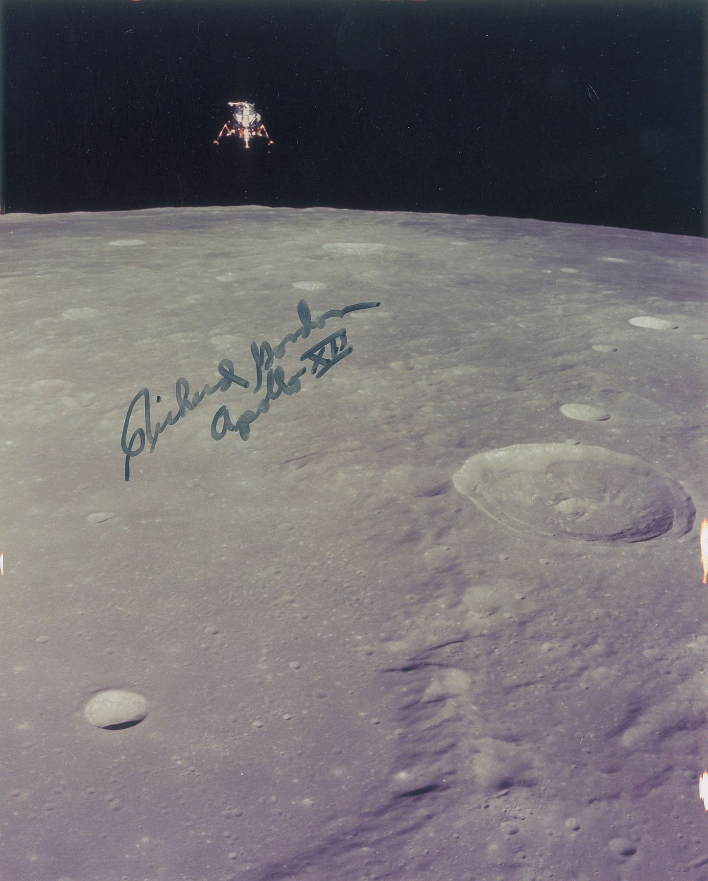 Attractive color semi-glossy 8 x 10 photo of the Lunar Module Intrepid hovering high above the lunar surface during the Apollo 12 mission, signed in black felt tip, "Richard Gordon, Apollo XII." In very fine condition.