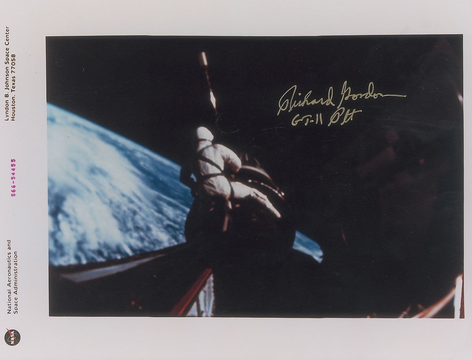 Color glossy 10 x 7.75 reprint of a red-numbered NASA photo of Richard Gordon performing an EVA during the Gemini 11 mission, signed in gold ink, "Richard Gordon, GT-11 Plt." In very fine condition.