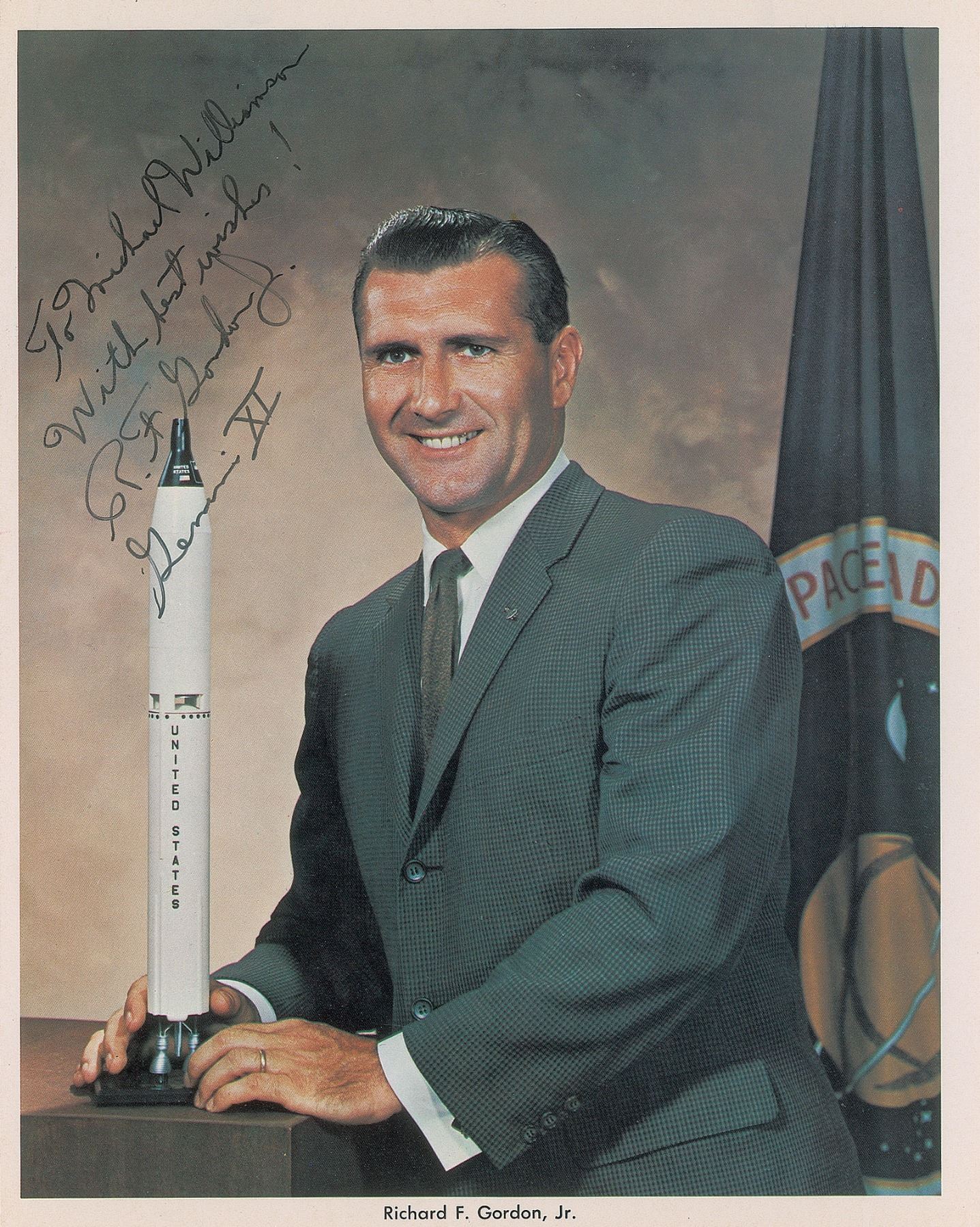 Official color 8 x 10 NASA lithograph of Gordon posing with a model rocket, signed and inscribed in black felt tip, "To Michael Williamson, With best wishes! R. F. Gordon, Jr., Gemini XI.” In fine condition, with a light paperclip impression to the top edge, and adhesive residue on the back from onetime storage in a magnetic photo album.