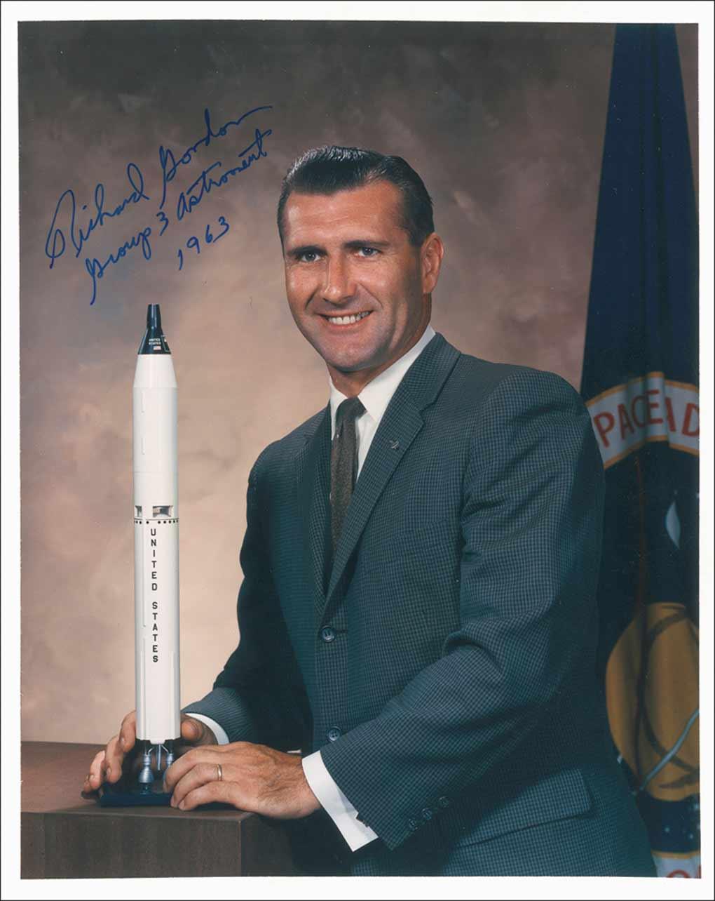 Color satin-finish 8 x 10 photo of Gordon posing with a model rocket, signed in blue felt tip, “Richard Gordon, Group 3 astronaut, 1963.” In very fine condition.