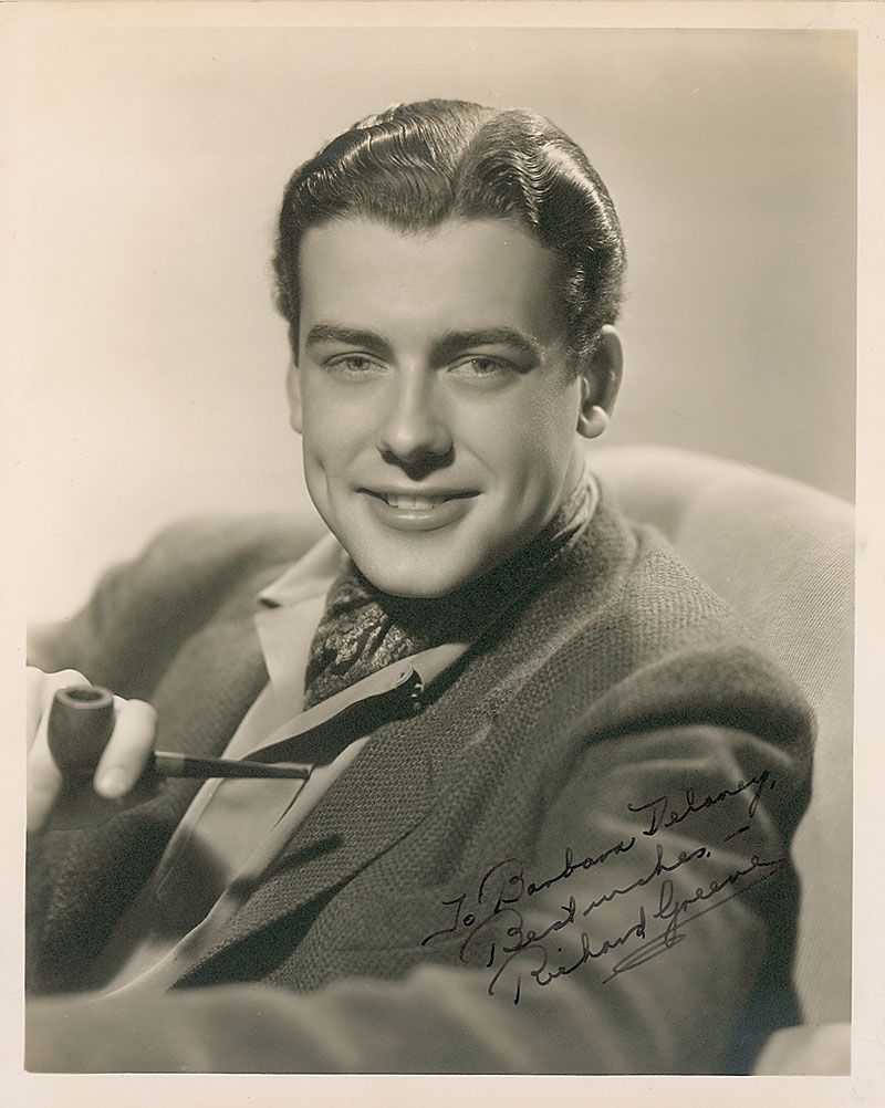 Dashing vintage matte-finish 8 x 10 portrait of Greene holding a pipe, signed and inscribed in fountain pen, “To Barbara Delaney, Best wishes, Richard Greene.” In fine condition.