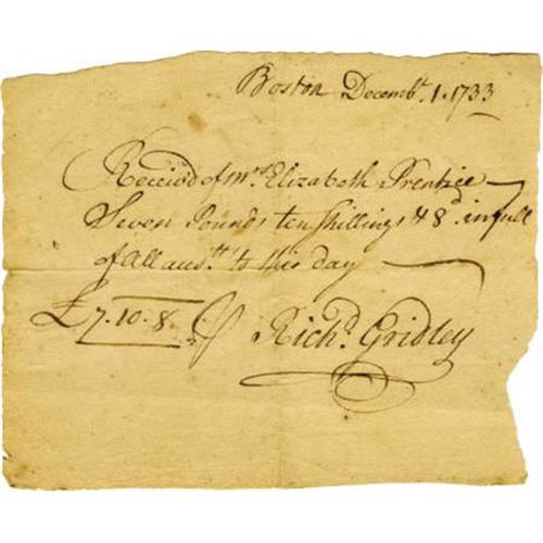 <B>Richard Gridley Autograph Document Signed</B></I> “<I>Richd Gridley,</B></I>” one page, 5” x 4”. Boston, December 1, 1733. In full, “<I>Receiv'd of Mrs. Elizabeth Prentice Seven Pounds ten Shillings & 8 in full of all acctts to this day.</B></I>” For his engineering service in the French and Indian War, Richard Gridley (1710-1781) was awarded a commission in the British army, a grant of the Magdalen Islands with an extensive seal and cod fishery, 3,000 acres of New Hampshire land, and a life annuity. He was made Chief Engineer in the New England Provincial Army in 1775 and, in that post, laid out the defenses on Breed's Hill where the Battle of Bunker Hill was fought on June 17, 1775. On the night of June 16th, Col. William Prescott and his men, using Gridley's outline, had dug a fortification 160 feet long and 80 feet wide with ditches and earthen walls. After Washington assumed his duties as Commander in Chief of the newly created army in July, Gridley, wounded at Bunker Hill while working the cannons, was appointed the first Chief Engineer of the Continental Army (1775-1776). At his furnace in Stoughton, he made the first cannon and mortars ever cast in America. He also directed the construction of the fortifications which forced the British to evacuate Boston in March 1776. When Washington moved his Army south, Gridley remained as Chief Engineer of the New England Department. Irregular edges at top and right. Fine condition.<BR><BR><b>Shipping:</b> Flat Material, Small (<a target="_blank" href="http://www.heritageauctions.com/common/shipping.php">view shipping information</a>)