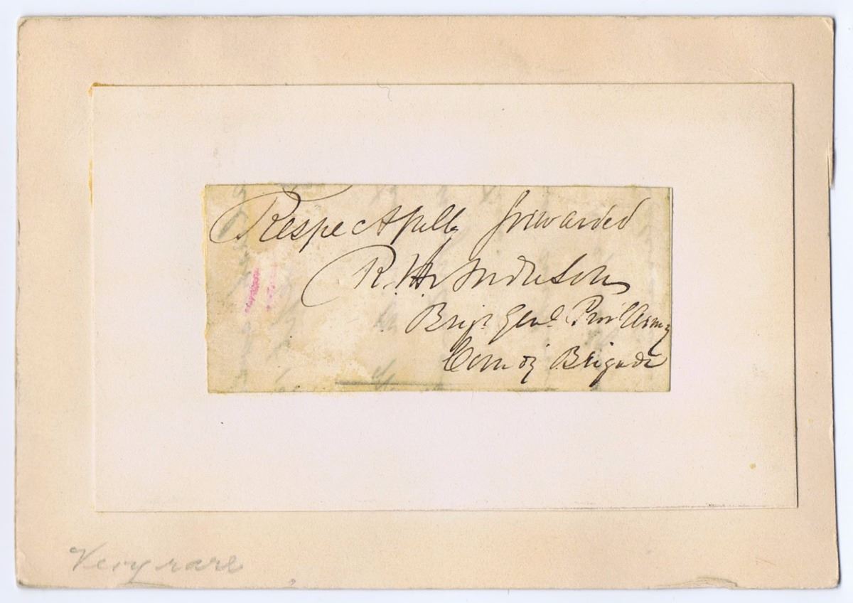 Of S.C. Confederate Lt. Gen. Signed with Confederate nomenclature "Prov(isiona)l Army...," very rarely encountered in context of a general officer's signature. Present at Fort Sumter - bombarding the adversary sharing his name (see following lot), and commanding Charleston Harbor following fall of Sumter. Served gallantly throughout the war, including at Gettysburg; wounded at Santa Rosa Island, Fla., Antietam - while in command at "Bloody Lane," and at The Wilderness. Attempting to grow cotton after the war, but lacking agricultural experience, Anderson lived in poverty, reduced "at one period virtually to the status of a day laborer"--Boatner. Closing portion of military document, in his hand: "Respectfully forwarded, R.H. Anderson, Brig. Genl., Prov(isiona)l Army, Com. of Brigade." (Anderson was appointed to this rank on July 19, 1861; this signature is probably between Feb. 1862, when he commenced command of a brigade, but before his further appointment to Maj. Gen. on July 14.) Uniform dark cream toning, faint red file notation "11" at left, mount with some edge wear from long-time file box, else about fine. Old pencil notation, "Very rare," this certainly applicable to his official use of the term "Provisional Army."