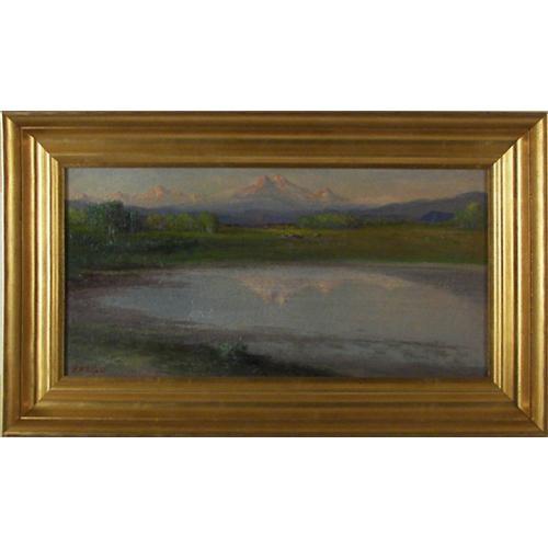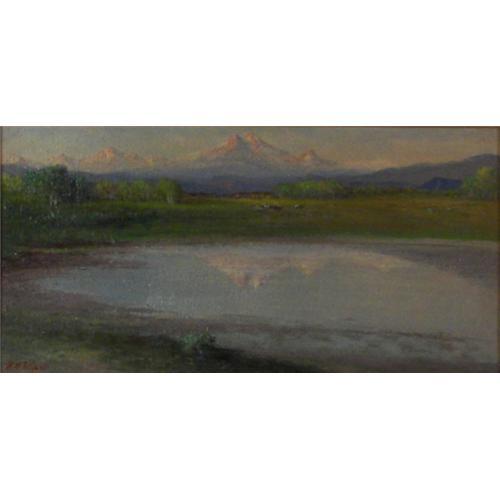 Richard H. Tallant (1853-1934) Oil on Board, "Long’s Peak At Sunrise From Near Lyons, Colo.", 1928, 10" x 20", signed lower left