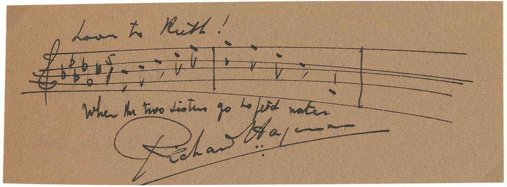 Composer, conductor, and pianist (1881–1966) who wrote film scores, vocal and chamber music, and art songs, including the popular ‘Do Not Go, My Love.’ AMQS on a light brown 6 x 2 sheet, signed and inscribed “Love to Ruth! Richard Hageman.” Hageman pens two bars of his song ‘At the Well,’ with their corresponding lyrics, “When the two sisters go to fetch water,” which were taken from a poem by Rabindranath Tagore. In fine condition.