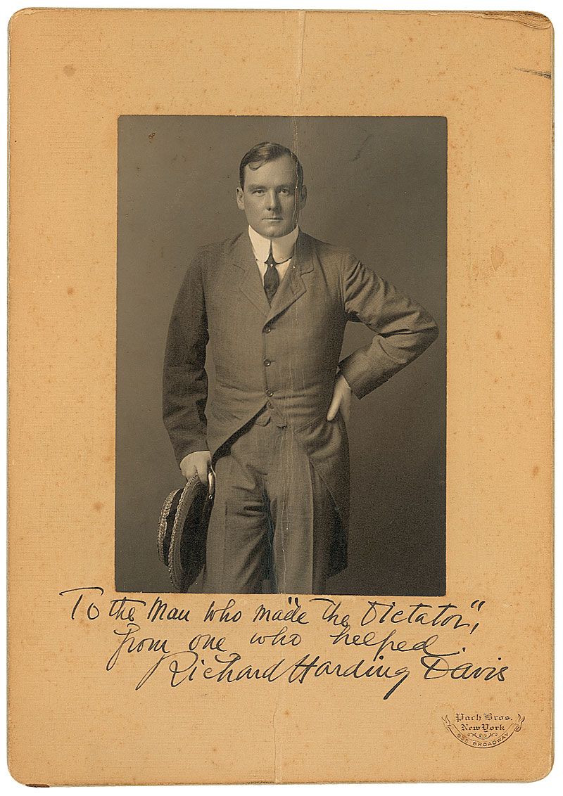 Influential journalist and writer of fiction and drama (1864–1916). Vintage matte-finish 3.75 x 5.5 three-quarter-length portrait of Davis affixed to its original 6.25 x 9 Pach Bros. mount, humbly signed and inscribed on the mount in black ink, “To the man who made ‘The Dictator,’ from one who helped, Richard Harding Davis.” In good to very good condition, with a heavy central vertical crease and crack, and light scattered foxing. An outstanding association, as Collier starred in the stage play The Dictator, which Davis had written. Provenance: William Collier Family Collection.