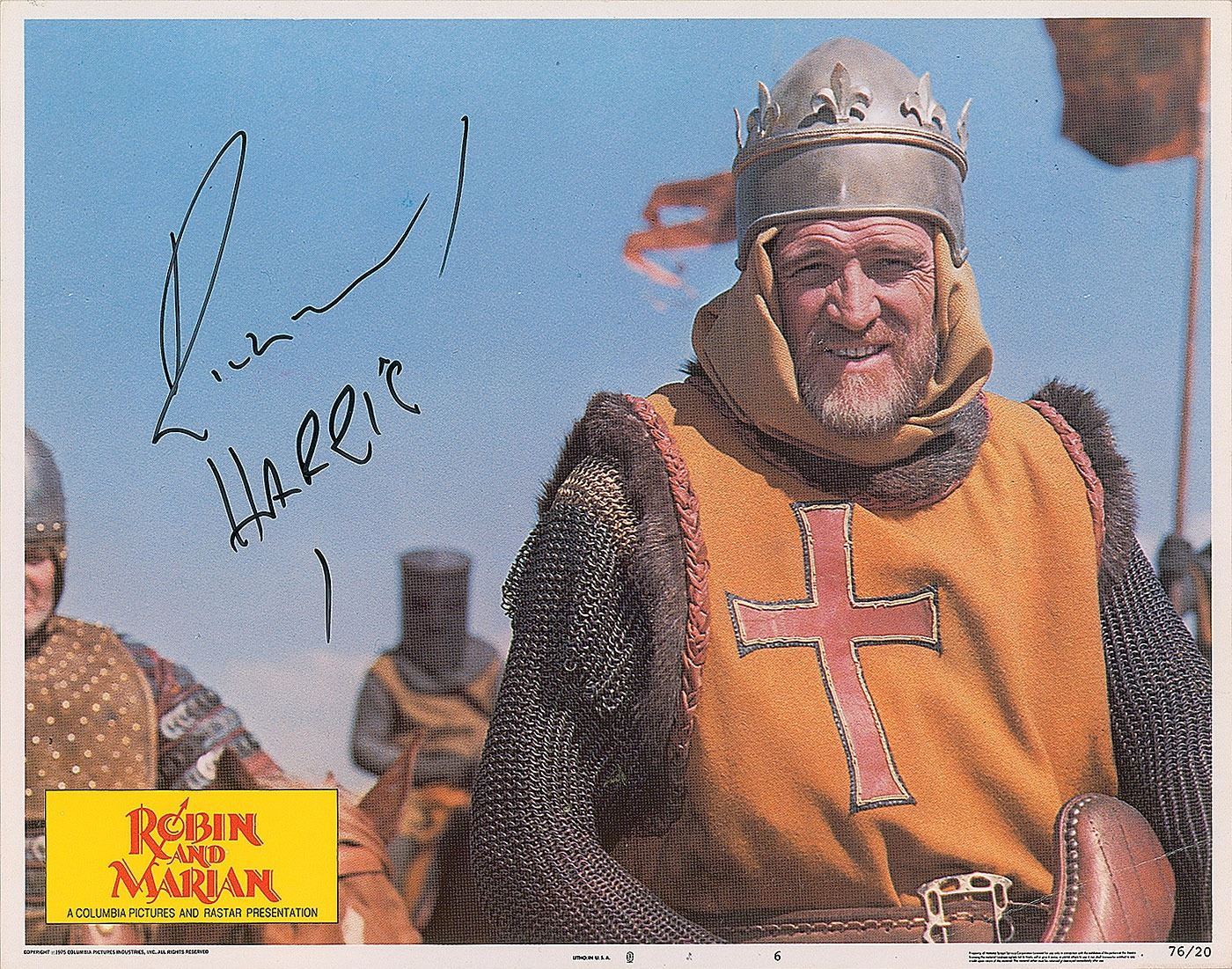 Color 14 x 11 lobby card for the 1976 film Robin and Marian starring Harris as King Richard, signed in black felt tip. In very good to fine condition, with a heavy crease to the lower right corner.