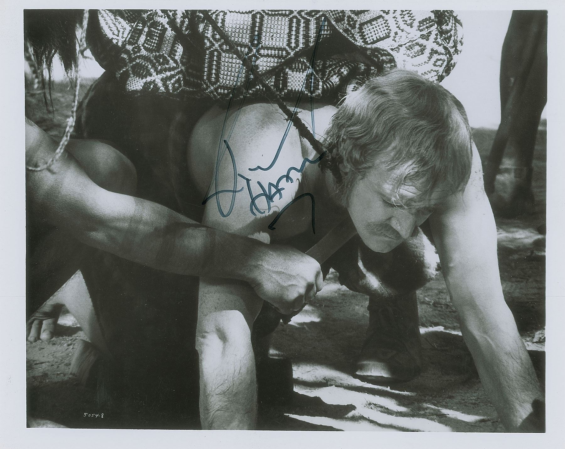 Glossy 10.25 x 8 photo of Richard Harris as John Morgan with a knife to his throat in the 1970 film A Man Called Horse, signed in black felt tip. Reverse bears an affixed caption. In fine condition.