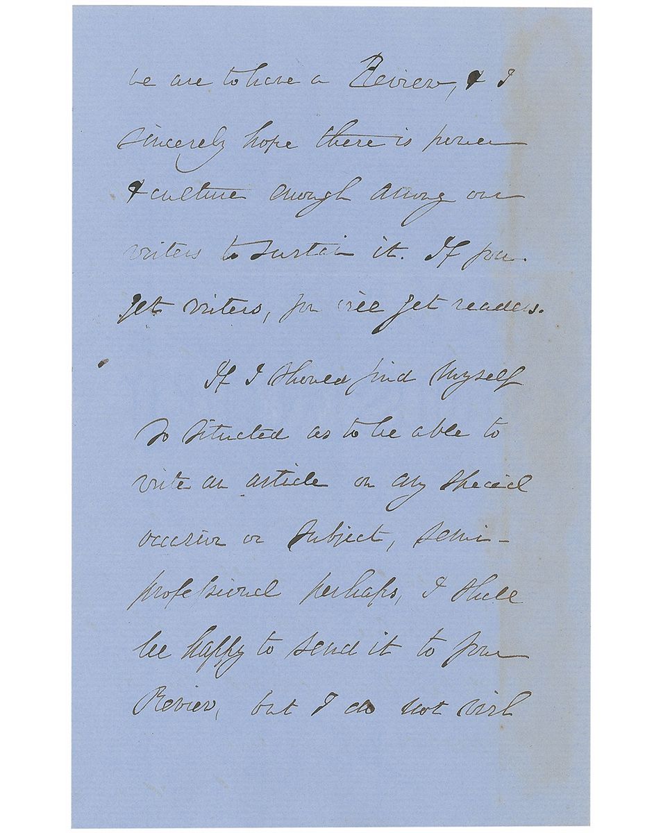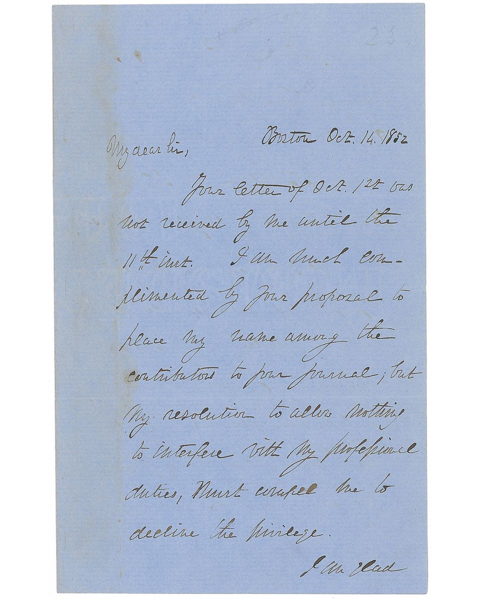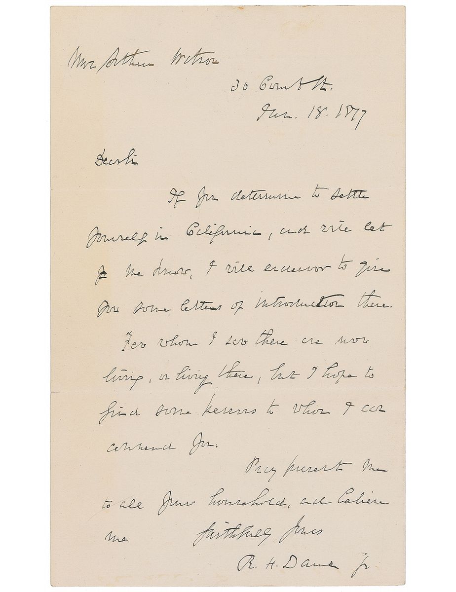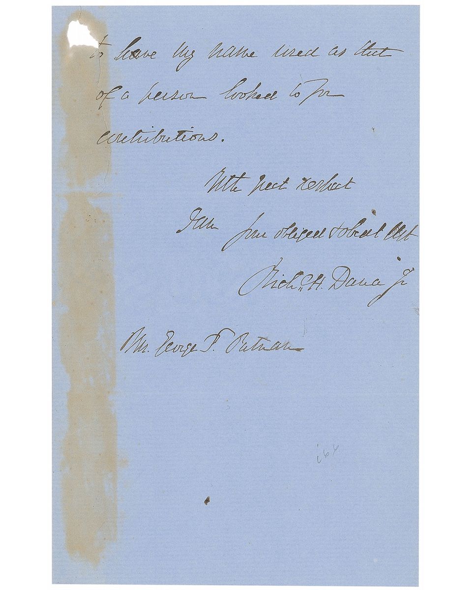 Two letters: one ALS signed “Rich. H. Dana Jr.,” three pages on two adjoining sheets, October 14, 1852, in part: “I am much complimented by your proposal to place my name among the contributors to your journal”; and an ALS signed “R. H. Dana Jr.,” one page, January 18, 1877, in part: “If you determine to settle yourself in California…I will endeavor to give you some letters of introduction there.” A significant tear to the top edge and a band of toning to the earlier letter, otherwise overall fine condition.
