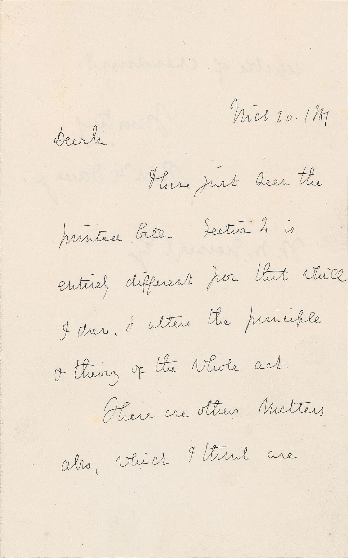 American lawyer and politician (1815–1882) best known as the author of the best-selling 1840 nautical memoir Two Years Before the Mast. ALS signed “Rich. H. Dana, Jr.,” one page both sides, 5 x 8, March 20, 1861. Letter to a gentleman, in part: "I have just seen the printed bill. Section 4 is entirely different from that which I drew, & alters the principle & theory of the whole act." In fine condition, with light intersecting folds.