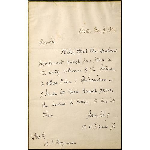 <Our item number 135745><B>Dana, Richard Henry, Jr.</B> (1815-1882) American writer and lawyer; best remembered for <I>Two Years Before the Mast</I>. Autograph letter signed ("R.H. Dana Jr."), 1p, 8 x 5 in., Boston, 9 Jan. 1863. Regarding having a piece placed "in the costly columns of the Times--to which I am a subscriber…it will much please the parties in India…." Fine. Matted and framed to an overall size of 19 x 10½ in. <BR>Estimated Value $150 - 200. <BR><BR>Our item number 135745<BR><IMAGES><P ALIGN="CENTER"><IMG SRC="http://www.goldbergcoins.net/liveauction/49jpegs/135745.jpg"> </P></IMAGES>
