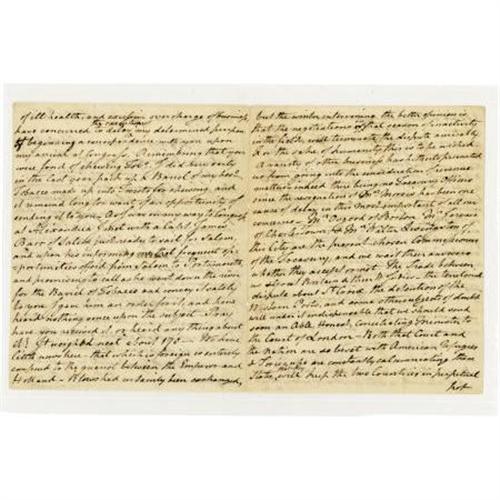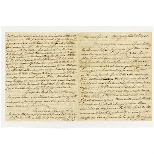 <B>Richard Henry Lee Autograph Letter Signed </B></I><I>"Richard Henry Lee" </B></I>as President of the United States<I> </B></I>in Congress Assembled, with postscript signed <I>"R.H.L.,"</B></I> four pages, 7.25" x 9", front and verso. New York, February 7, 1785. Recipient isn't named, but by content, it is most probably <B>William Whipple</B></I>, Signer of the Declaration of Independence<B>. </B></I>In part, <I>"It is a long time now since I have had the pleasure to hear from you yet there is no man living whom I wish more to hear from. When I am at home, my situation being removed both from the Post and from such places as Vessels usually stop at has in great degree discouraged me from writing because I reflect on the uncertainty of my letters ever reaching their destination. But you my friend are placed more fortunately, from your place Vessels come to Potomac & Rappahanock rivers every now & then, and they would bring Letters safely so that they would reach me. I shall always receive them with much thankfulness, and I shall always answer them when it is in my power…Since I came to Congress, the circumstances of ill health, and excessive overcharge of business, have concerned to delay the execution of my determined purpose of beginning a correspondence with you upon my arrival at Congress. Remembering that you were fond of chewing Tob. I did very early in the last year pack up a Band of my best Tobacco made up into Twists for chewing…As I was on my way to Congress, at Alexandria I met with a Capt. James Barr of Salem just ready to sail for Salem, and upon his informing me that frequent opportunities offerd from Salem to Portsmouth, and promising to call as he went down the river for the Band of Tobacco and convey it safely to you, I gave him an order for it and have heard nothing since upon the subject. Pray have you received it or heard anything about it?…<BR><BR>"We have little news here -that which is foreign is entirely confined to the quarrel between the Emperor and Holland - Blows had certainly been exchanged, but the winter intervening the better opinion is, that the negotiations in that season of inactivity in the field, will terminate the dispute amicably. For the sake of humanity it is to be wished. A variety of other business has hitherto prevented us from going into the consideration of revenue matters - indeed there being no Treasury Officers since the resignation of Mr. Morris has been one cause of delay in this most important of all our concerns - Mr. Osgood of Boston, Mr. Garvais of Charlestown, & Mr. Walter Livingston of this City are the present chosen Commissioners of the Treasury, and we wait their answers whether they accept or not. The Trade between us & Great Britain & their W. Indies - the territorial dispute about St. Croix, the detention of the Western Posts, and some other subjects of doubt will render it indispensable that we should send soon an Able, Honest, Conciliating Minister to the Court of London. Both that Court and the Nation are so beset with American Refugees & Tories, who are constantly calumniating these States that they will keep the two Countries in perpetual hot water and prevent any amicable settlement between us. The presence of such a Minister as I have described will banish a Myriad of those Miscreants.</B></I> On February 24, 1785, 17 days later, Congress elected John Adams as the first U.S. Minister plenipotentiary, to represent the United States of America at the Court of Great Britain. <I>When the Commissioners who are now treating with the Western Indians shall have finished that business, I expect that we shall proceed in Congress to take measures for benefiting the United States by the Sale of some part of that moist fertile and extensive region that has been yielded to the U.S. by Virginia. I am much concerned to hear that you are afflicted with a disorder in your breast - suppose you were to take a Voyage to Virginia next Fall and pass your next winter there - We shall be very happy in your company, and your health will probably be much benefitted by the voyage…</B></I>" In a postscript signed with initials Lee asks <I>"What is the price pr. pound of Spermacate Candles at Portsmouth, is it the best place of getting them?"</B></I><BR><BR>William Whipple (1730-1785) represented New Hampshire in the Continental Congress from 1775-1779 and, with Richard Henry Lee and 54 others, signed the Declaration of Independence. Whipple had declined reelection to Congress and returned to New Hampshire where he served as financial receiver for New Hampshire from 1782-1784 and Associate Judge of the Superior Court of N.H. from 1782 until his death. After what was then described as "a painful and lingering illness," William Whipple died on November 28, 1785. It was his wish that an autopsy be performed to see what had caused his pain and the results showed hardening of the arteries leading to his heart. In this letter, Lee writes he is <I>"concerned to hear that you are afflicted with a disorder in your breast."</B></I> Richard Henry Lee (1732-1794) served in the Continental Congress from 1774-1779 and again from 1784-1785 and in 1787. From November 30, 1784 to November 22, 1785, the period during which he sent this letter, he was President of the United States in Congress Assembled. There are nicks where the horizontal folds meet the edges and miniscule holes at the folds of the first sheet. It is enclosed in acid-free Mylar. This magnificent letter in fine condition, from one Signer to another, about the problems facing the Continental Congress, would be a superb addition to any collection of American autographs.<BR><BR><b>Shipping:</b> Flat Material, Small (<a target="_blank" href="http://www.heritageauctions.com/common/shipping.php">view shipping information</a>)