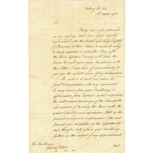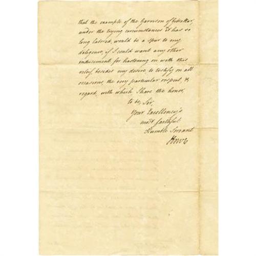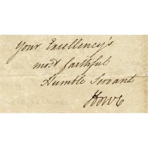 <B>Richard Howe Historic Manuscript Letter Signed</B></I> “<I>Howe,</B></I>” two pages, 8” x 12.5”, front and verso. To General Elliot. Written aboard his ship <I>Victory</B></I> while at sea. Victory at Sea, October 3, 1782. In full, “<I>Being now so advanced in my passage, that I can assure myself, my arrival with the Troops, and large Supply of Provisions, & Stores I have to conduct, may be daily expected in Gibraltar Bay, after the time Captain Conway will have the honor to wait upon your Excellency with this letter; I send him off immediately, to give you the earliest advice of my destination. He will be to meet me, when he finds it practicable, with any commands he may receive from your Excellency, or information from Captain Curtis, respecting the most secure anchorage of the Transports and manner of landing the Stores with the greatest facility and expedition. But as the present conveyance is precarious, I do not forward your dispatches, by this opportunity and therefore only assure your Excellency further, on the subject of my appointment that the example of the Garrison of Gibraltar, under the trying circumstances it has so long labored, would be a spur to my diligence, if I could want any other inducement for hastening on with this relief, besides my desire to testify on all occasions, the very particular respect & regard with which I have the honor to be, Sir, Your Excellency's most faithful Humble Servant.</B></I>” Sir George Augustus Elliot served as Governor of Gibraltar from 1777 until his death in 1790. Since the British garrison at Gibraltar had not received any supplies since April 1781, Lord Howe sailed for Gibraltar in September 1782. He took a fleet of 183 ships, 38 of which were ships of the line. A ship-of-the-line was a type of naval warship constructed from the 17th century through the mid-19th century. Waiting for him in Algeciras Bay, only four miles from Gibraltar, was a Franco-Spanish fleet of 48 ships-of-the-line, and these followed Howe; Britain had been at war with France and Spain since 1778. <I>Victory</B></I> arrived off the Straits of Gibraltar on October 11, 1782, eight days after this letter was written and, putting the merchant ships before him, Howe headed for the Mole, the detached breakwater in the harbor. All the merchantmen moored safely between October 16th and 18th, so that Gibraltar had another year's supplies. HMS <I>Victory</B></I> is a 104-gun ship-of-the-line of the Royal Navy, built between 1759 and 1765, the oldest naval ship still in commission and the only surviving example of a ship-of-the-line. She sits in dry dock in Portsmouth, England, as a museum ship. Lord Nelson was captain of the HMS <I>Victory</B></I> from 1803 until 1805 when he was killed aboard the ship in the Battle of Trafalgar. Minor separation at mid-horizontal fold. Light toning. Very fine condition.<BR><BR><b>Shipping:</b> Flat Material, Small (<a target="_blank" href="http://www.heritageauctions.com/common/shipping.php">view shipping information</a>)