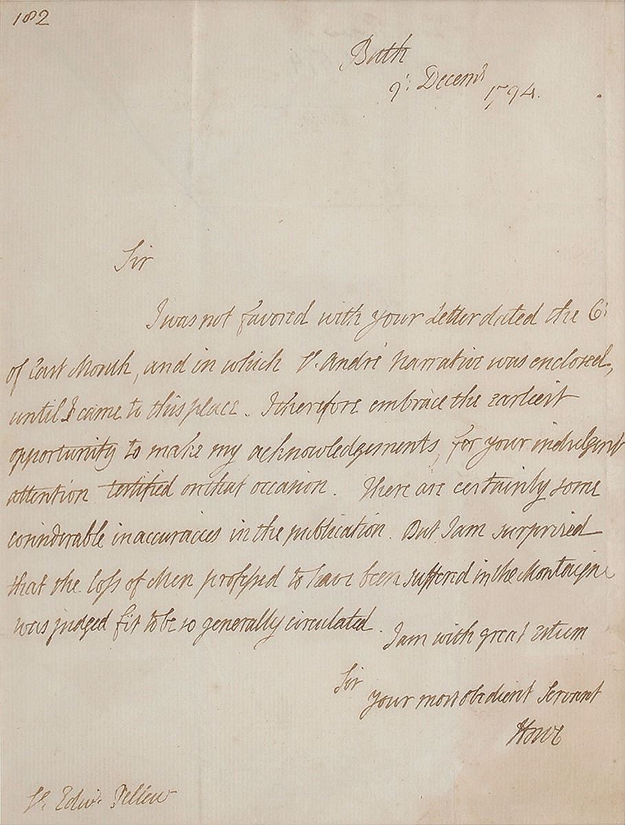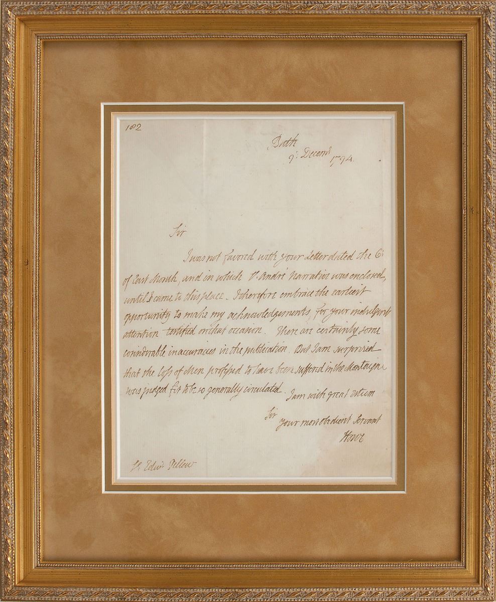 British naval officer (1726–1799) best known for his service in the American Revolution, during which he acted as a naval commander and a peace commissioner. ALS signed “Howe,” one page, 7.5 x 9.75, December 9, 1794. Howe comments on a manuscript, in part: “There are certainly some considerable inaccuracies in the publication. But I am surprised that the loss of men professed to have been suffered in the Montaigne was judged fit to be generally circulated.” Gorgeously triple-matted and framed to an overall size of 13.75 x 16. In very good to fine condition, with scattered light toning, a bit darker in the signature area.