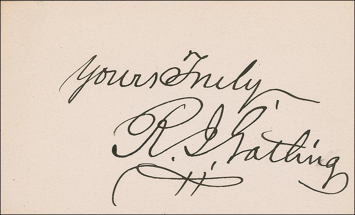 Inventor of the eponymous machine gun which has been estimated to have killed over 250,000 men since 1862. Bold ink signature, “Yours truly, R. J. Gatling,” on an off-white 4 x 2.5 card. In fine condition.