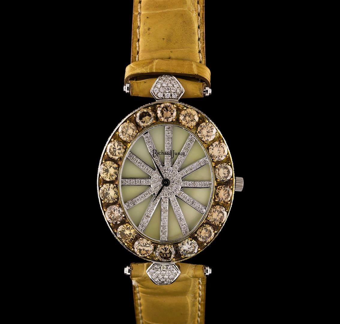 One, Richard Junot Big Oval wristwatch electronically tested 18KT White Gold, Oval Case: 43 x 36mm, Case Shoulders: set with diamonds, Case Back: engraved with the manufacturers name, model name, and information, Case lugs: set with diamonds, Crown: scalloped, Bezel: diamond set, Crystal: synthetic sapphire. Movement: quartz, Signed Dial: mother of pearl with diamond set ribbons for numerals, and Blued Steel hands, Bracelet: saddle stitched leather strap. Condition: G-5 Fine. Eight inch length, adjustable. Containing: Eighteen prong set round brilliant cut diamonds, measuring 5.20 - 5.00 x 3.06mm (depth est.) approximate total weight of 18 Stones = 8.74ct. The group is composed of a mix of naturally colored faint brown, very light brown and light brown diamonds. Graded in the setting. Clarity: SI-1 to SI-2 One Hundred Seventy-Four prong set round brilliant cut diamonds, measuring 1.30 - 1.20 x 0.75mm (depth est.) approximate total weight of 174 Stones = 1.24ct. Graded in the setting. Clarity: SI-1 to I-2. Color: G - I One Hundred Four prong set round brilliant cut diamonds, measuring 1.10 - 1.00 x 0.63mm (depth est.) approximate total weight of 104 Stones = 0.44ct. Graded in the setting. Clarity: SI-2 to I-2. Color: G - I. Total Weight of Diamonds 10.42ct. Weight of Watch 82.66gm. AIG Appraised at $36,000.00.