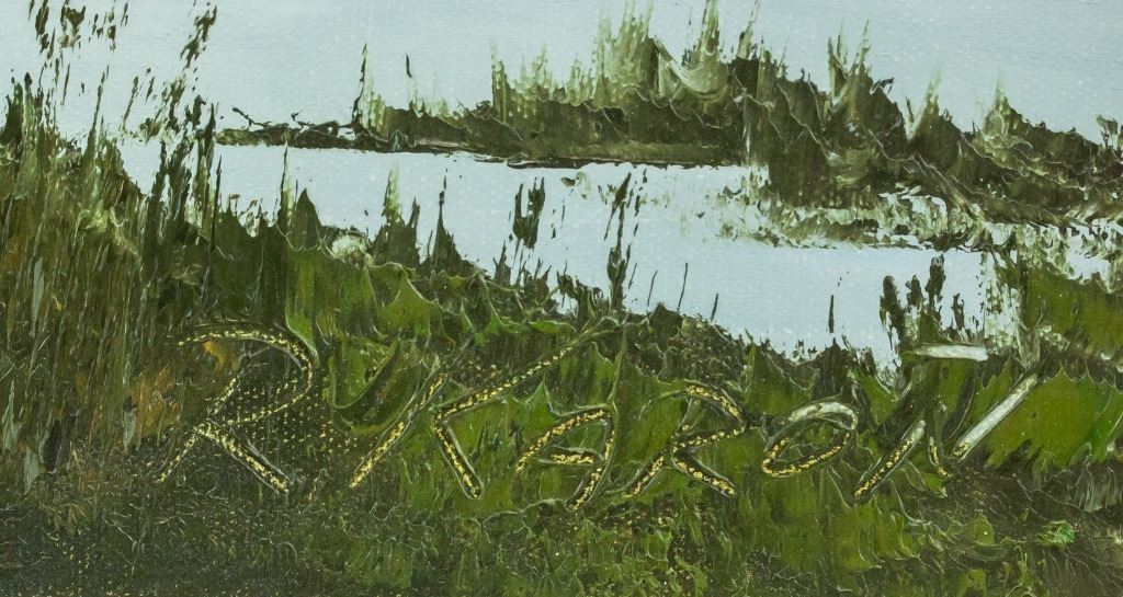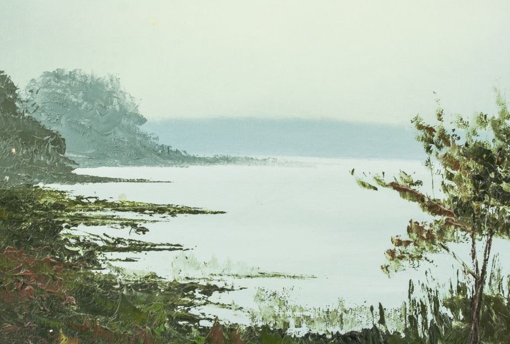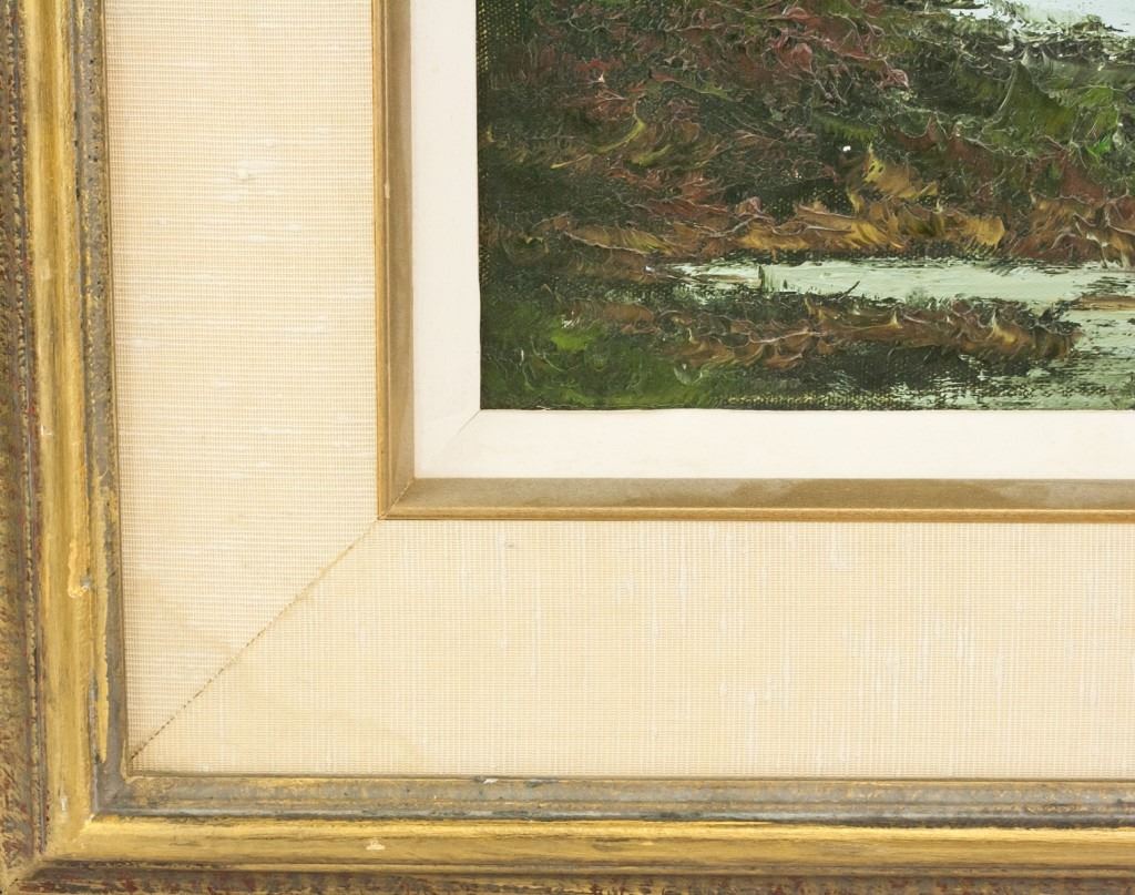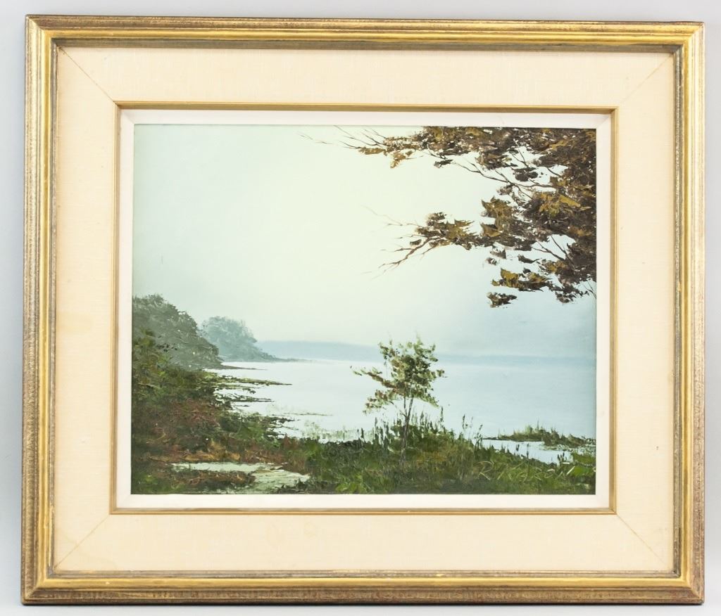 Oil on canvas, framed. Featuring lake landscape scene. Signed "R. KARON" in the bottom right corner. "An Original OIL PAINTING by Canadian Master Richard Karon" stamped on verso. Richard Karon (1928-1987, Canadian). 38.5 x 49 cm (15.25 x 19.25 in), Frame: 62.5 x 73 cm (24.5 x 28.5 in).