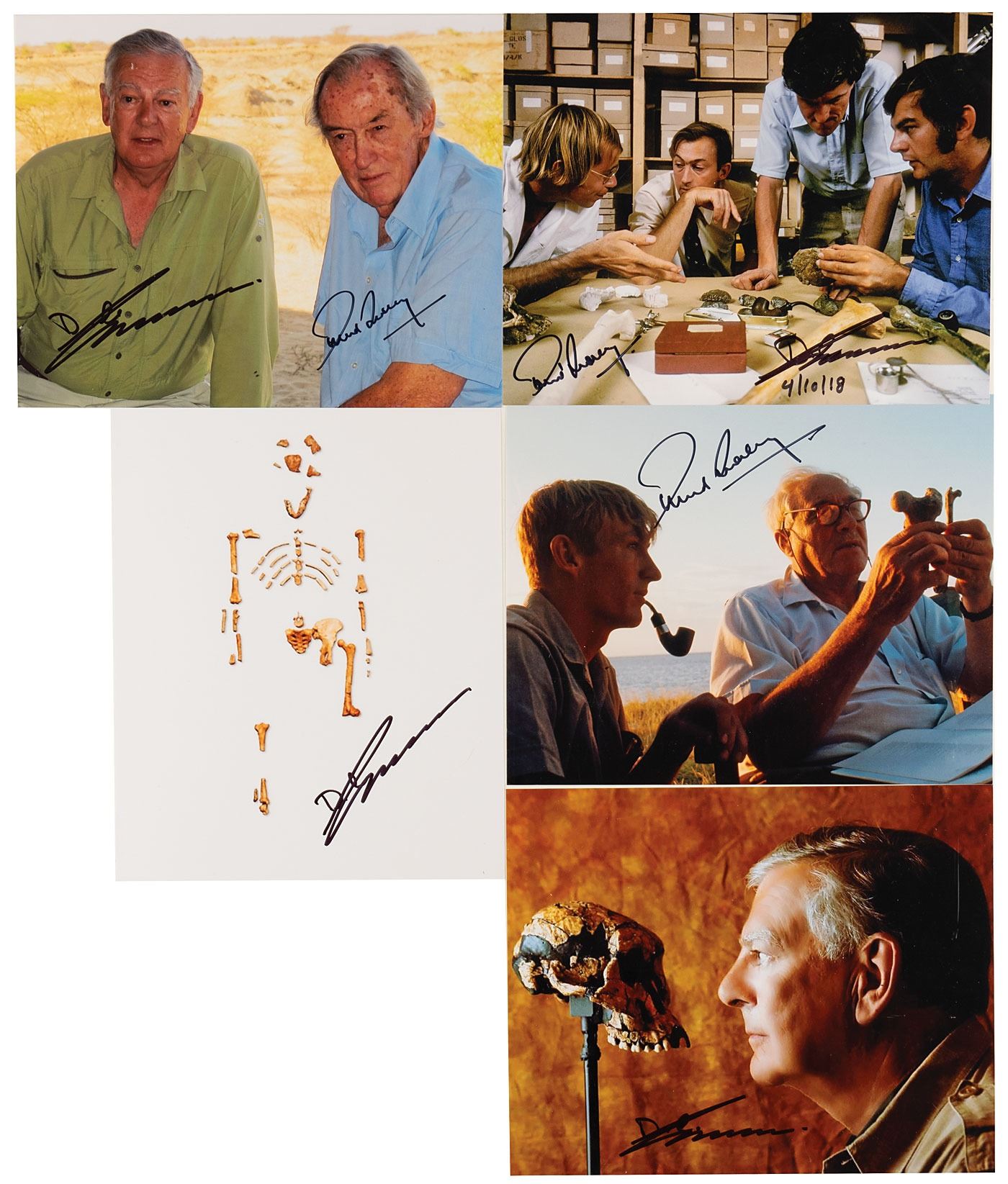 Five color glossy photos, 8 x 10 and 10 x 8, each signed in black felt tip by either Donald Johanson or Richard Leakey or both (2), with images including: Tim White, Leakey, Bernard Wood, and Johanson examining the latter's newly discovered Australopithecus; Leakey and Johanson side by side; Leakey inspecting a fossil next to a younger paleoanthropologist; Johanson face-to-face with the skull of another early hominin; and a partial skeleton of an Australopithecus afarensis female found at Hadar, in the Afar region of Ethiopia. In overall fine condition. Accompanied by a personal Turkana Basin Institute business card belonging to Leakey, who signs in blue ink; and a personal Arizona State University business card belonging to Johanson, who signs in black ink.