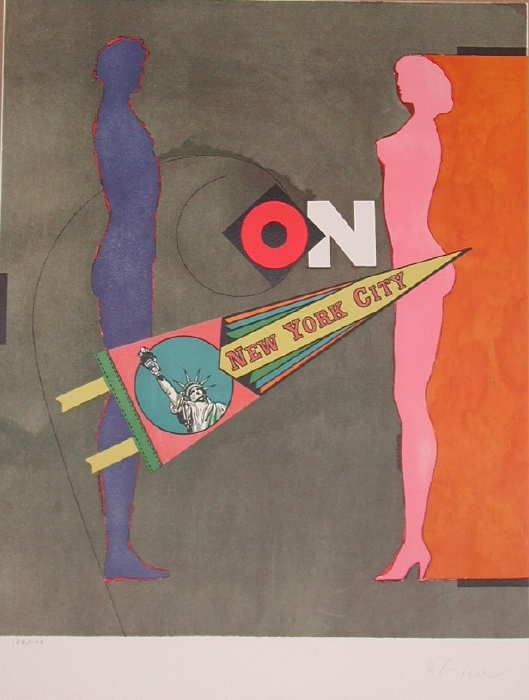 Hand drawn 26"x20" stone lithograph on Arches paper from the "Fun City" portfolio, 1970. Signed in pencil by the artist and numbered in an edition of 175. Margins trimmed on three sides as shown. Domestic shipping $20. International depending upon location.