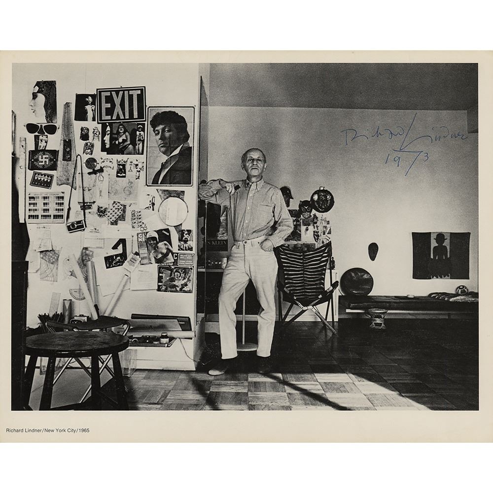 German-American painter (1901–1978) who drew upon expressionistic exaggeration, Surrealist fantasy, and Cubist manipulations of form. Oversized 14 x 11 print of Lindner in his New York City apartment in 1965, signed in blue ballpoint, "Richard Lindner, 1973." In fine condition.