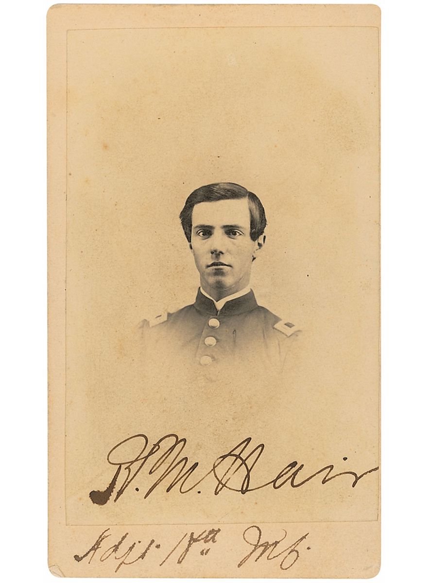Original 2.25 x 4 carte-de-visite photo by Brooks and Blauvelt of Port Hudson, Louisiana, signed below the image in black ink, “R. M. Hair, Adjt 18th Inf.” In fine condition, with ink and pencil notations and light surface loss on reverse.