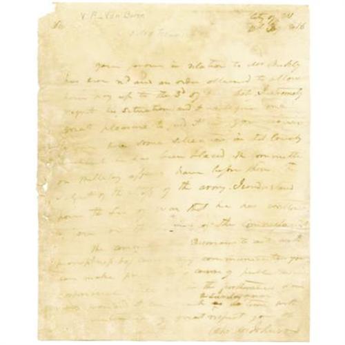 <B>Richard M. Johnson Autograph Letter Signed</B></I> “<I>Rh: M: Johnson,</B></I>” one page, 8” x 9.75”. "<I>City of W</B></I> ashington ," January 10, 1816. Recipient not identified. In part, “<I>The Committee on Military Affairs have before them the subject of the Staff of the army. I understand from the Sec of War that he has written to you…The committee is desirous to act with promptness & of conveying any communication you can make from a long course of public service…</B></I>” Richard M. Johnson, a colonel in the War of 1812 while serving in Congress, is credited by some historians with personally killing Indian Chief Tecumseh. He used this in his political career as he represented Kentucky in the House (1807-1819, 1829-1837) and Senate (1819-1829).He served as Van Buren's Vice President from 1837-1841. From the <I>House Journal,</B></I> February5, 1816: “Mr. Johnson, of Kentucky, from the committee on Military Affairs, reported a bill for organizing the general staff, and making further provision for the army of the United States, which was read the first and second time and committed to the committee of the whole House on the bill making provision for an additional military academy.” The “additional military academy” was to be a naval academy which was eventually established at Annapolis 29 years later. The letter is water stained and toned, affecting its legibility. There are tears in the blank left margin. Penciled notations by a collector at top. In fair condition.<BR><BR><b>Shipping:</b> Flat Material, Small (<a target="_blank" href="http://www.heritageauctions.com/common/shipping.php">view shipping information</a>)