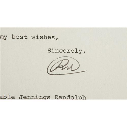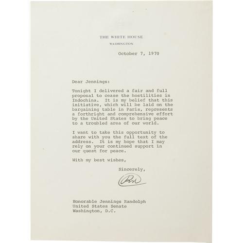 <B>Richard M. Nixon fine content Typed Letter Signed "<I>RN</B></I></B></I>"<B> as President,</B></I> one page on White House letterhead, 7 x 9 inches, Washington, October 7, 1970 to Senator Jennings Randolph of West Virginia concerning his October 7 peace proposal to end the Vietnam War. He writes: "Dear Jennings: Tonight I delivered a fair and full proposal to cease the hostilities in Indochina. It is my belief that this initiative, which will be laid on the bargaining table in Paris, represents a forthright and comprehensive effort by the United States to bring peace to a troubled area of our world. I want to take this opportunity to share with you the full text of the address. It is my hope that I may rely on your continued support in our quest for peace. With my best wishes..." Nixon's October 7 proposal for a cease fire in Vietnam, "an Indochina Peace Conference" that would include also Laos and Cambodia, a withdrawal of U.S. troops, and an appeal for a final political settlement was met with a curt rebuff by the Communist delegation in Paris the following Day. The delegation responded in the negative, characterizing the proposal as "a maneuver to deceive world opinion." Two miniscule staple holes at top, else extremely clean and in very fine condition. Housed in a handsome blue leather slipcase with gilt titled ribbed spine and gilt eagle on cover with blue cloth interior. A wonderful presentation of a fine content letter.<BR><BR><b>Shipping:</b> Small Collectibles (<a target="_blank" href="http://www.heritageauctions.com/common/shipping.php">view shipping information</a>)