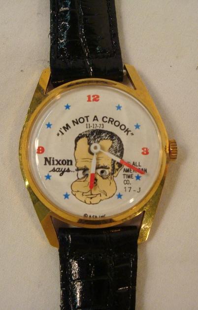 Richard M. Nixon "I am not a Crook" Wristwatch with a leather band. Made by the American Time Co.