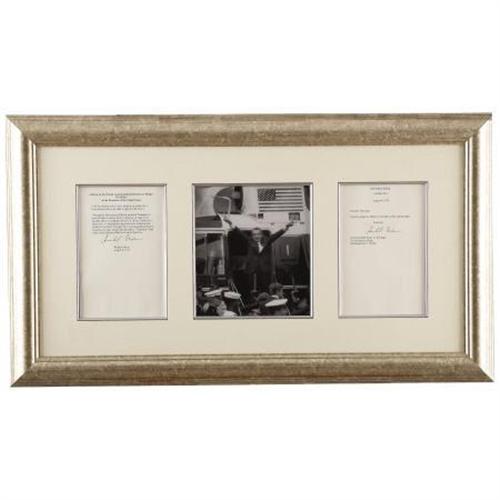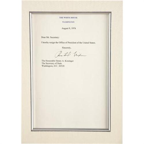 <B>Two Richard Nixon Signed Documents Pertaining to His Resignation</B></I> The first document is a bookplate printing of his August 8, 1974, “Address to the Nation Announcing the Decision to Resign The Office of the President of the United States” and reads in full: “<I>In all my decisions that I have made in my public life, I have always tried to do what is right for the Nation. Throughout the long and difficult period of Watergate, I have felt it was my duty to preserve, to make every possible effort to complete the term in office to which you elected me. In the past few days however, it has become evident to me that I no longer have a strong political base in Congress to justify continuing that effort. Therefore I shall resign the presidency effective at noon tomorrow. </B></I> signed <I>Richard Nixon</B></I>.” The second, on White House letterhead, is a facsimile of Nixon's resignation announcement to Secretary of State Henry A. Kissinger, reading in full: “<I> Dear Mr. Secretary: I hereby resign the Office of President of the United States. Sincerely, </B></I> signed <I>Richard Nixon</B></I>”. Both items are tastefully matted alongside a familiar 8" x 9" photograph of Nixon to an overall size of 32" x 18". Documents and frame are in fine condition. <BR><BR><b>Shipping:</b> Framed - with Glass, Medium (<a target="_blank" href="http://www.heritageauctions.com/common/shipping.php">view shipping information</a>)