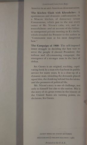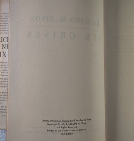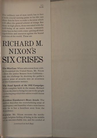 Six Crises (Doubleday & Company Inc., 1962) hard cover book, signed by former U.S. President Richard M. Nixon. 460 pages.