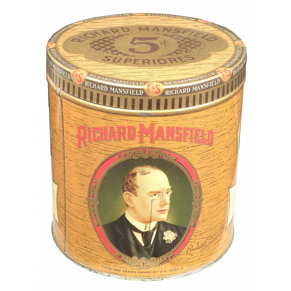 Richard Mansfield Cigar Tin for 50 Cigar. 5 cents, Liberty Can Co. Near Mint. 5 1/2 X 5 3/4 inches in diameter.