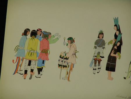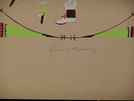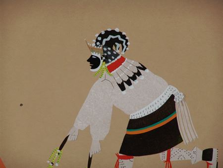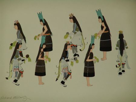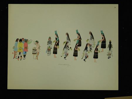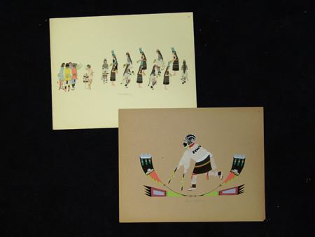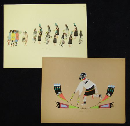 Ca. 1970s, Two of his famous works from the 1972 Bell edition of the 1932 "Pueblo Indian Painting." Includes plate #17, a Ram Dancer, and plate #24, A Dance Group. Very good condition, loose. 15-1/2" x 19-1/2"
