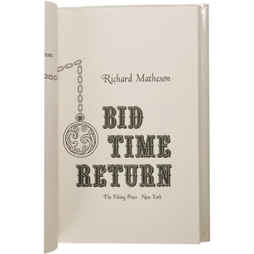 <B>Richard Matheson:<I> Bid Time Return.</B></I></B></I> (New York: Viking, 1975), first edition, 278 pages, cloth with titles, 8vo (5.75" x 8.5"), fine in an unclipped fine jacket. This book was the basis for the film <I>Somewhere in Time</B></I>. <I>From the Ventura Collection.</B></I><BR><BR><b>Shipping:</b> Books & Catalogs (<a target="_blank" href="http://www.heritageauctions.com/common/shipping.php">view shipping information</a>)