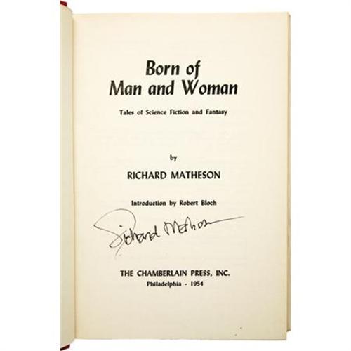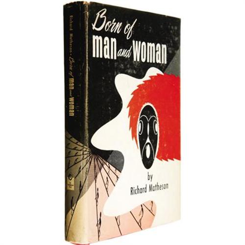 <B>Richard Matheson: Signed <I>Born of Man and Woman</B></I></B></I> (Philadelphia: The Chamberlain Press, Inc., 1954), first edition, author's first book, 252 pages, red cloth with black titles, dust jacket design by Mel Hunter, 8vo (6" x 8.75"), dust jacket. Signed "<I>Richard Matheson</B></I>" on the title page. Near fine in a near fine unclipped jacket. It is believed that only about 650 copies of this book were issued before a flood, and later a fire destroyed the remaining unbound sheets.<BR><BR><b>Shipping:</b> Books & Catalogs (<a target="_blank" href="http://www.heritageauctions.com/common/shipping.php">view shipping information</a>)