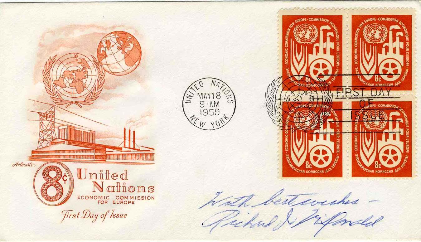 McDonald's founder Richard McDonald signed first day cover with a cachet honoring the United Nations Economic Commission for Europe. Signed in blue ballpoint pen, ''With best wishes / Richard J. McDonald.'' Postmarked the United Nations, New York on 18 May 1959. In near fine condition.