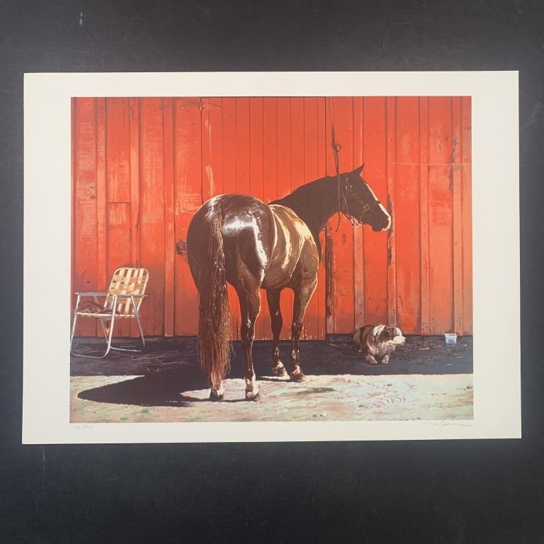 Richard McLean's "Kahlua Lark" limited edition print, signed lower right, and numbered 126/300 lower left. This piece is of a horse and a dog, against the side of red barn, and is in excellent condition.