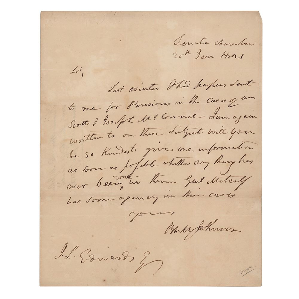 American politician (1780–1850) who served as vice president under Martin Van Buren, and was said to have been the soldier who killed the Shawnee chief Tecumseh at the Battle of the Thames. ALS signed “Rch. M. Johnson,†one page, 7.75 x 9.75, January 20, 1821. Handwritten letter to J. L. Edwards written from the "Senate Chamber," in part: "Last winter I had papers sent to me for Pensions in the cases of Mr. Scott & Joseph McConnell—I am again written to on these subjects. Will you be so kind as to give me information as soon as possible…Genl. Metcalf has some agency in these cases." In fine condition.