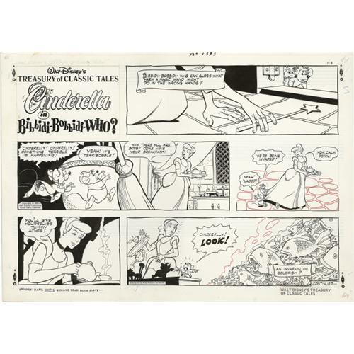 <B>Richard Moore - Walt Disney's Treasury of Classic Tales Sunday Comic Strip Original Art, dated 7-8-84 (Disney, 1984).</B></I> Who can guess what harm a magic wand might do in the wrong hands? When the castle gets invaded by goldfish, can Cinderella's stepsisters be far behind? This Sunday by Richard Moore has an image area of 21" x 14". There is some light staining; otherwise the condition is Very Good.