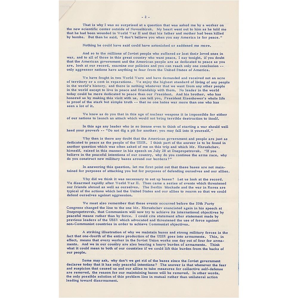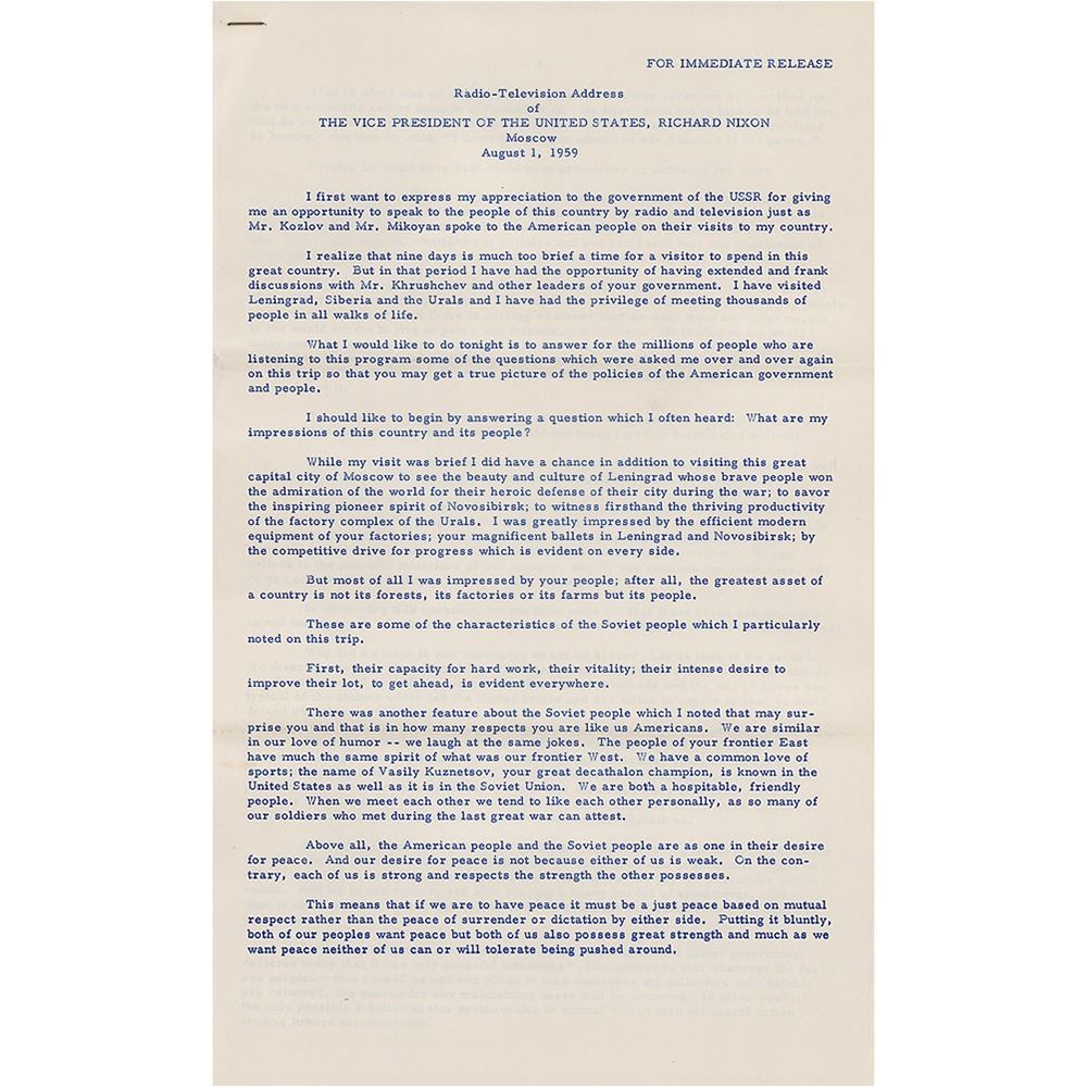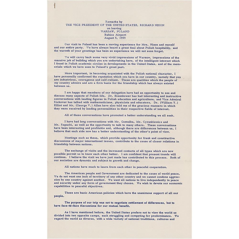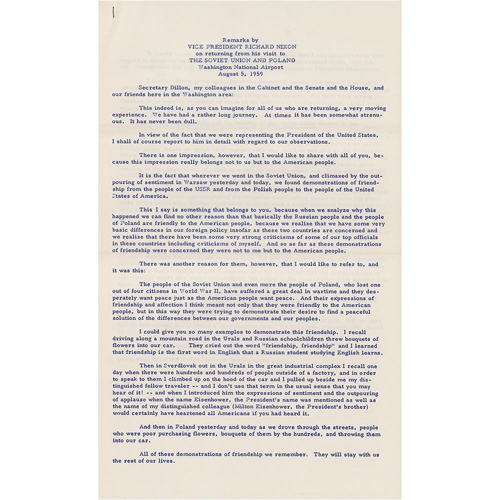 Four original 8.5 x 14 printed transcripts by Vice President Richard Nixon related to his historic 1959 goodwill tour to the Soviet Union. During this trip, Nixon and Nikita Khrushchev held their famous ‘Kitchen Debate,’ an impromptu exchange that occurred at the American National Exhibition in Moscow on July 24th; their fervid dialogue, which became a defining moment in the Cold War, was on the merits of capitalism versus communism. The earliest six-page transcript, marked "For Immediate Release," dated August 1, 1959, features Nixon’s speech to a Soviet Radio/TV audience, in part: "I first want to express my appreciation to the government of the USSR for giving me an opportunity to speak to the people of this country…the American people and the Soviet people are as one in their desire for peace…Putting it bluntly, both of our peoples want peace but both of us also possess great strength and…neither of us can or will tolerate being pushed around…only aggressor nations have anything to fear from the U.S…Mr. Khrushchev, himself raised [the question]…‘why do you continue the arms race, why do you construct new military bases around our borders?’…I could cite statement after statement made by previous leaders of the USSR which advocated and threatened the use of force against non-Communist countries in order to achieve Communist objectives…one-fourth of the entire production of the USSR goes into armaments…We had a monopoly on the atomic bomb when on June 14, 1946, we submitted the Baruch plan for international control of atomic energy. What happened? It was rejected by the USSR…President Eisenhower made his offer of open skies aerial inspection. What happened? It was rejected by the USSR…If Mr. Khrushchev means…victory of Communism over the United States and other countries, this is a horse of a different color. For we have our own ideas as to what system is best for us…Mr. Khrushchev predicted our grandchildren would live under Communism…We do not object to his saying this will happen. We only object if he tries to bring it about." The other transcripts, dated August 2nd and 5th, 1959, provide Nixon’s remarks as he arrives in Warsaw, Poland (one page), his remarks as he leaves Poland (two pages), and his remarks upon arriving back in Washington D.C. (two pages), which also contains good content summarizing his trip. In overall fine condition, with folds as issued. Accompanied by the original ‘Office of the Vice President’ mailing envelope with a preprinted Nixon franking signature, addressed to Kentucky Congressman William Natcher.