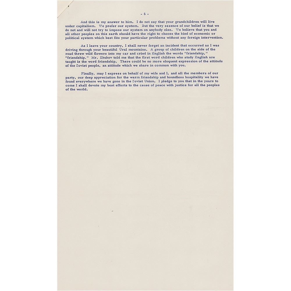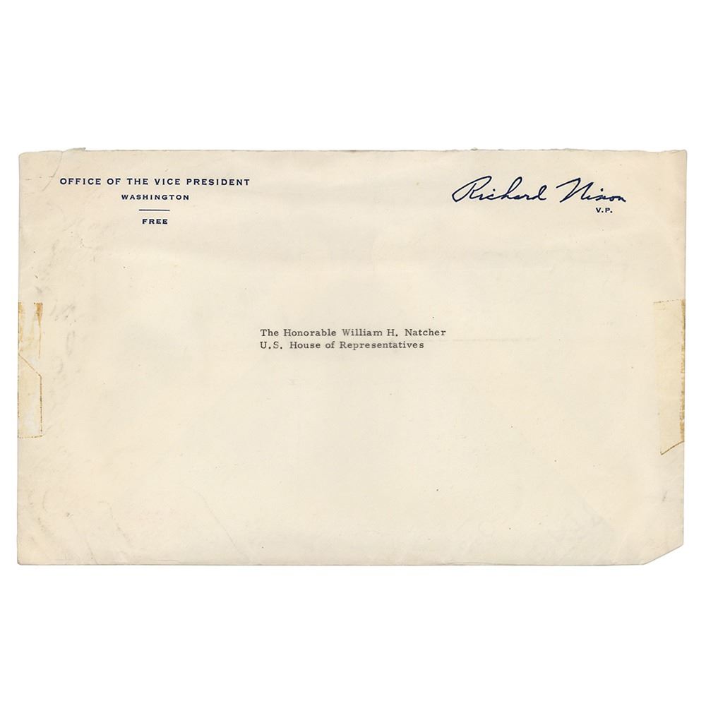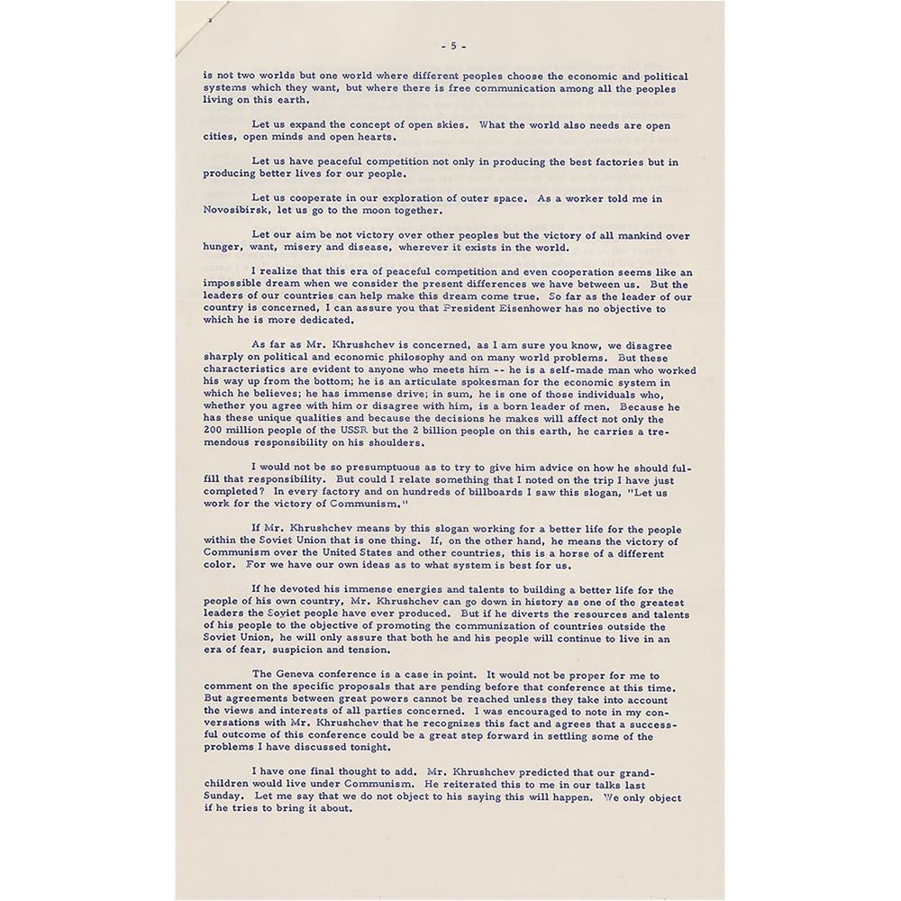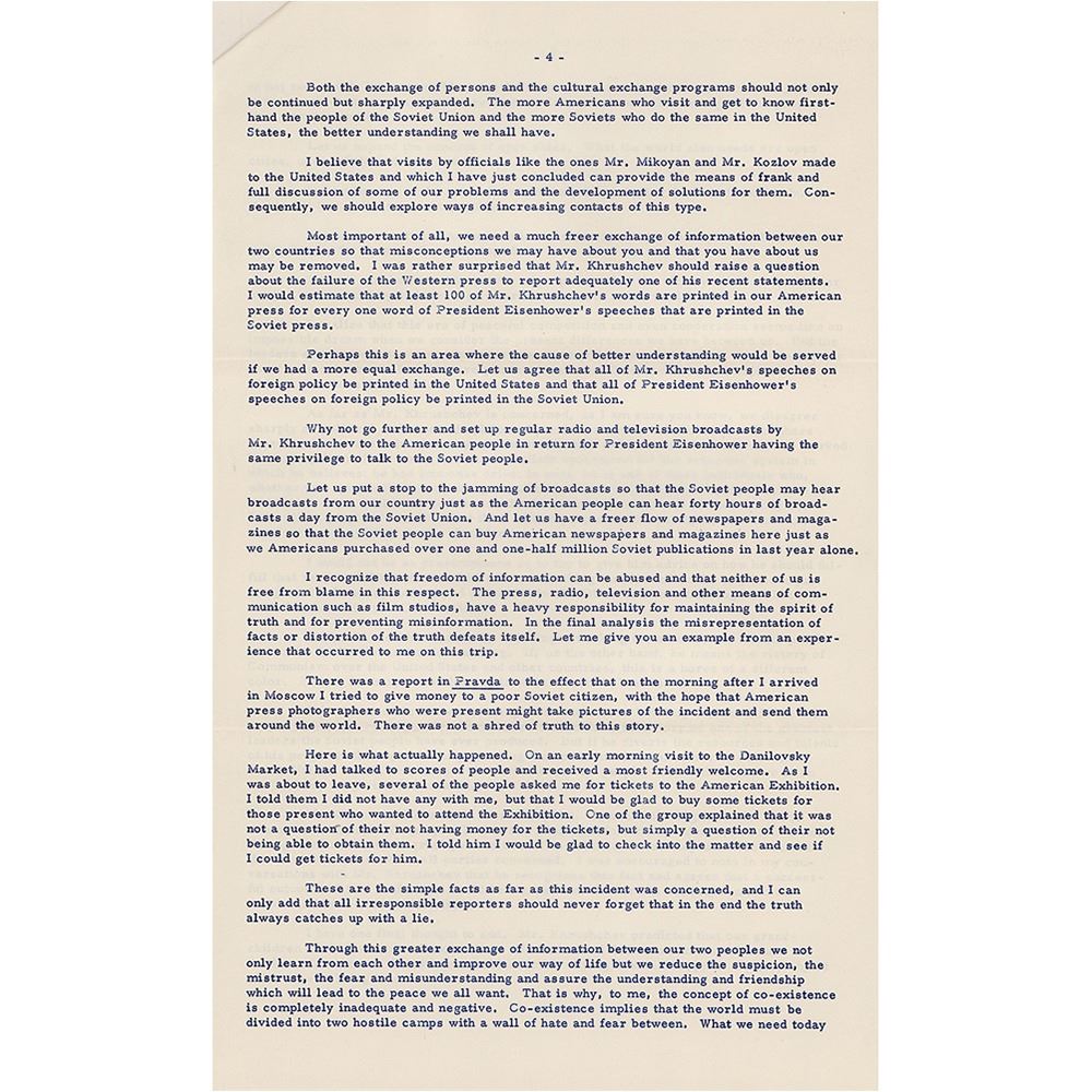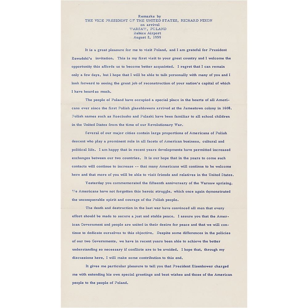 Four original 8.5 x 14 printed transcripts by Vice President Richard Nixon related to his historic 1959 goodwill tour to the Soviet Union. During this trip, Nixon and Nikita Khrushchev held their famous ‘Kitchen Debate,’ an impromptu exchange that occurred at the American National Exhibition in Moscow on July 24th; their fervid dialogue, which became a defining moment in the Cold War, was on the merits of capitalism versus communism. The earliest six-page transcript, marked "For Immediate Release," dated August 1, 1959, features Nixon’s speech to a Soviet Radio/TV audience, in part: "I first want to express my appreciation to the government of the USSR for giving me an opportunity to speak to the people of this country…the American people and the Soviet people are as one in their desire for peace…Putting it bluntly, both of our peoples want peace but both of us also possess great strength and…neither of us can or will tolerate being pushed around…only aggressor nations have anything to fear from the U.S…Mr. Khrushchev, himself raised [the question]…‘why do you continue the arms race, why do you construct new military bases around our borders?’…I could cite statement after statement made by previous leaders of the USSR which advocated and threatened the use of force against non-Communist countries in order to achieve Communist objectives…one-fourth of the entire production of the USSR goes into armaments…We had a monopoly on the atomic bomb when on June 14, 1946, we submitted the Baruch plan for international control of atomic energy. What happened? It was rejected by the USSR…President Eisenhower made his offer of open skies aerial inspection. What happened? It was rejected by the USSR…If Mr. Khrushchev means…victory of Communism over the United States and other countries, this is a horse of a different color. For we have our own ideas as to what system is best for us…Mr. Khrushchev predicted our grandchildren would live under Communism…We do not object to his saying this will happen. We only object if he tries to bring it about." The other transcripts, dated August 2nd and 5th, 1959, provide Nixon’s remarks as he arrives in Warsaw, Poland (one page), his remarks as he leaves Poland (two pages), and his remarks upon arriving back in Washington D.C. (two pages), which also contains good content summarizing his trip. In overall fine condition, with folds as issued. Accompanied by the original ‘Office of the Vice President’ mailing envelope with a preprinted Nixon franking signature, addressed to Kentucky Congressman William Natcher.