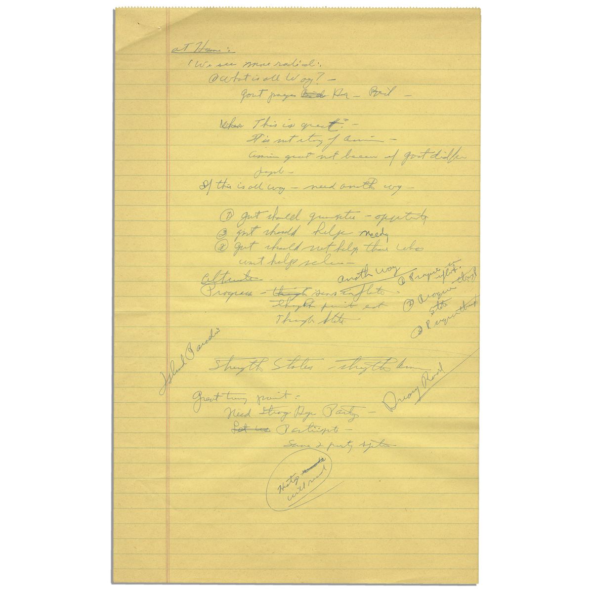 Historically important manuscript by Richard Nixon with detailed, handwritten notes from August 1966. As Nixon was gearing up to run for President in the 1968 election, he here outlines various foreign policy themes integral to his future campaign, with Vietnam at the forefront. Upon a sheet of legal paper, Nixon further outlines his response to Vietnam on the domestic front with notes in part, headed, ''At Home:'', then ''we see more radical / what is all way? / If this is all way -- need another way / ...should help need / ...should not help those who won't help selves... / Great turning point / Need Rep. Party...'' Document measures 8.5'' x 13.25'' on one single sheet with two staple holes at top left. Near fine.