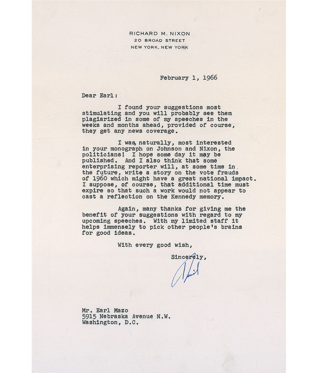 TLS signed “Dick,” one page, 7.25 x 10.5, personal letterhead, February 1, 1966. Letter to Earl Mazo, author of Richard Nixon: A Political and Personal Portrait. In full: “I found your suggestions most stimulating and you will probably see them plagiarized in some of my speeches in the weeks and months ahead, provided of course, they get any news coverage. I was, naturally, most interested in your monograph on Johnson and Nixon, the politicians! I hope some day it may be published. And I also think that some enterprising reporter will, at some time in the future, write a story on the vote frauds of 1960 which might have a great national impact. I suppose, of course, that additional time must expire so that such a work would not appear to cast a reflection on the Kennedy memory. Again, many thanks for giving me the benefit of your suggestions with regard to my upcoming speeches. With my limited staff it helps immensely to pick other people’s brains for good ideas.” In fine condition.