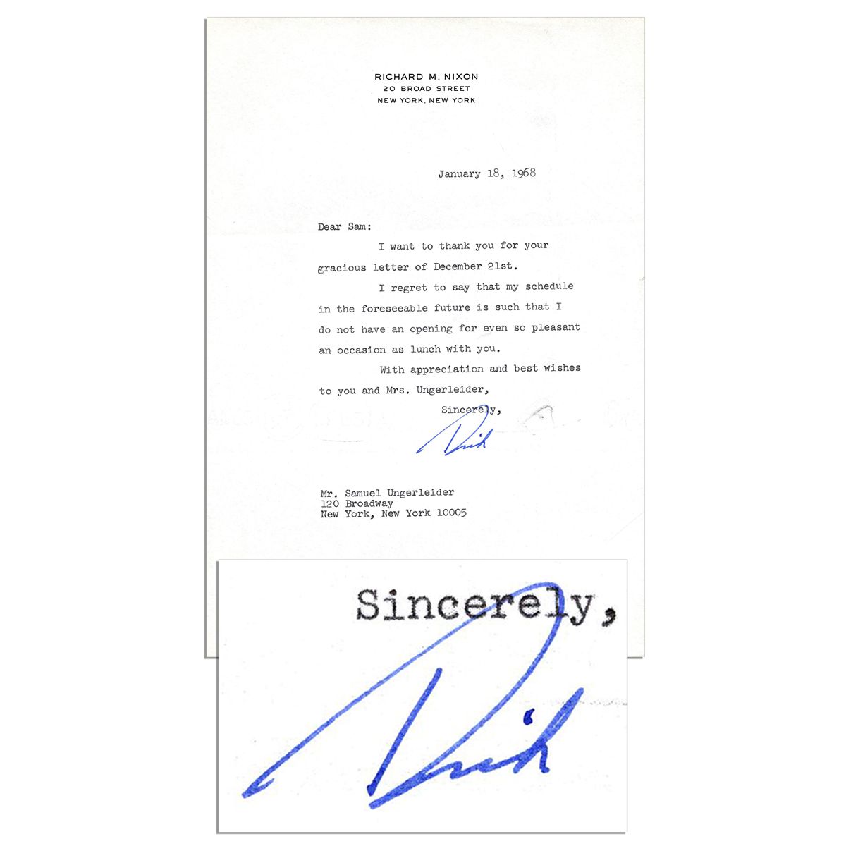 Richard Nixon typed letter signed on personal ''20 Broad Street / New York, New York'' stationery, dated 18 January 1968, one year before taking office. Letter is addressed to a Mr. Samuel Ungerleider and reads in part: ''Dear Sam: I want to thank you for your gracious letter of December 21st. I regret to say that my schedule in the foreseeable future is such that I do not have an opening for even so pleasant an occasion as lunch with you...'' Signed ''Dick'' in blue ink. 1pp. letter measures 7.25'' x 10.5'' and includes original envelope marked personal. Near fine.