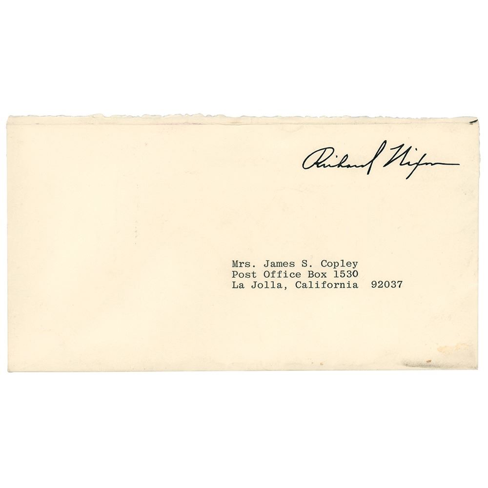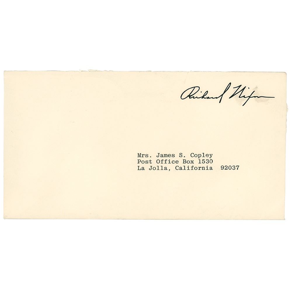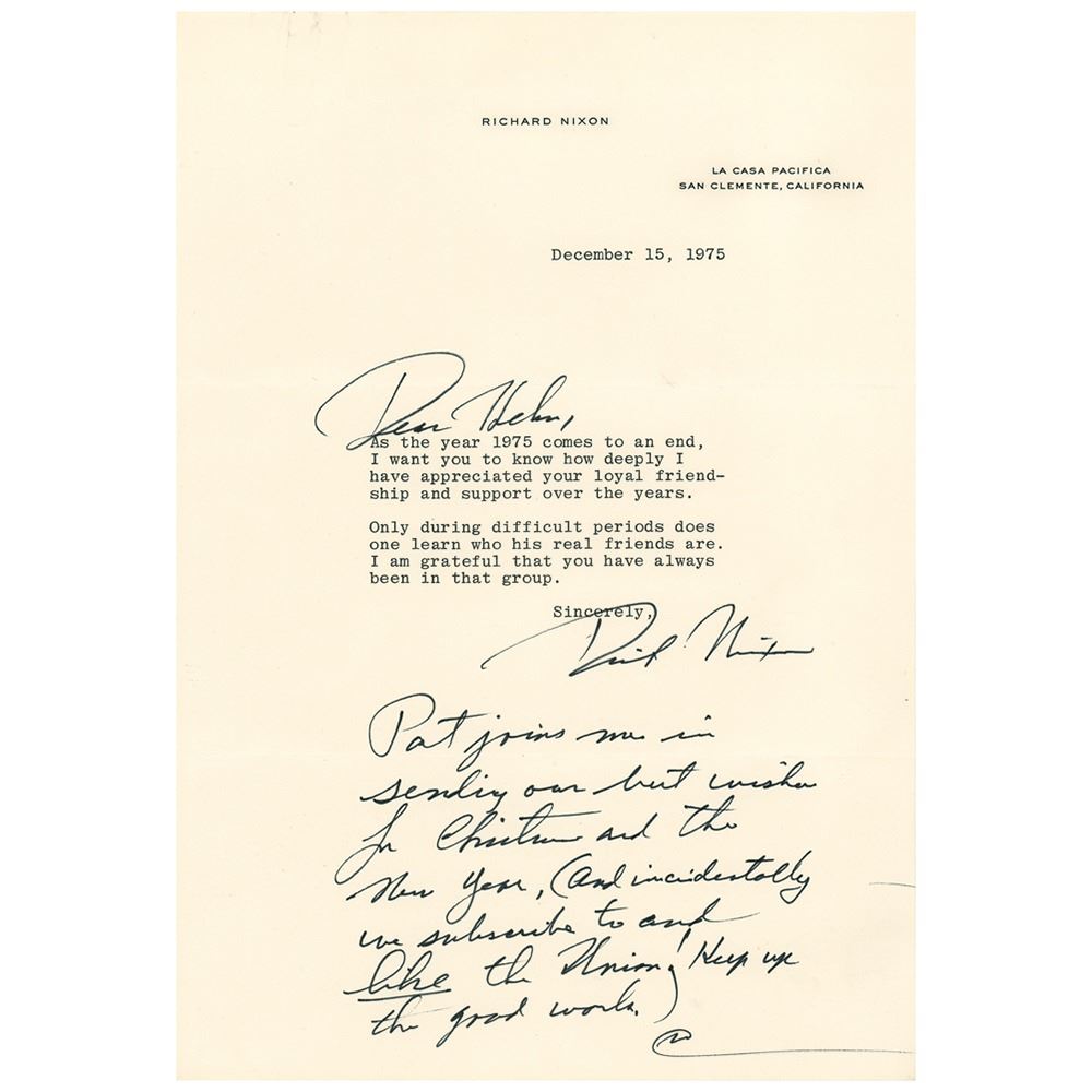 Two TLSs, both signed, "Dick Nixon," each one page, 7.25 x 10.5, personal letterhead. Both letters are to Helen Copley, the widow of newspaper publisher James S. Copley, with Nixon adding the greeting in his own hand, as well as a postscript to each letter. The first letter, dated December 15, 1975, reads, in full: "As the year 1975 comes to an end, I want you to know how deeply I have appreciated your loyal friendship and support over the years. Only during difficult periods does one learn who his real friends are. I am grateful that you have always been in that group." Nixon's handwritten postscript reads: "Pat joins me in sending our best wishes for Christmas and the New Year, (And incidentally we subscribe to and like the Union. Keep up the good work.) N."