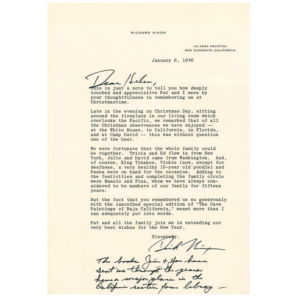 Second letter, dated January 6, 1976, reads, in part: "This is just a note to tell you how deeply touched and appreciative Pat and I were by your thoughtfulness in remembering us at Christmastime. Late in the evening on Christmas Day, sitting around the fireplace in our living room which overlooks the Pacific, we remarked that of all the Christmas observances we have enjoyed-at the White House, in California, in Florida, and at Camp David-this was without question one of the best. We were fortunate that the whole family could be together. Tricia and Ed flew in from New York, Julie and David came from Washington." Postscript at the bottom reads, "The books Jim & you have sent us through the years have a major place in the California section of our library." The letters are housed in a luxurious custom-made clamshell case. In overall fine condition.